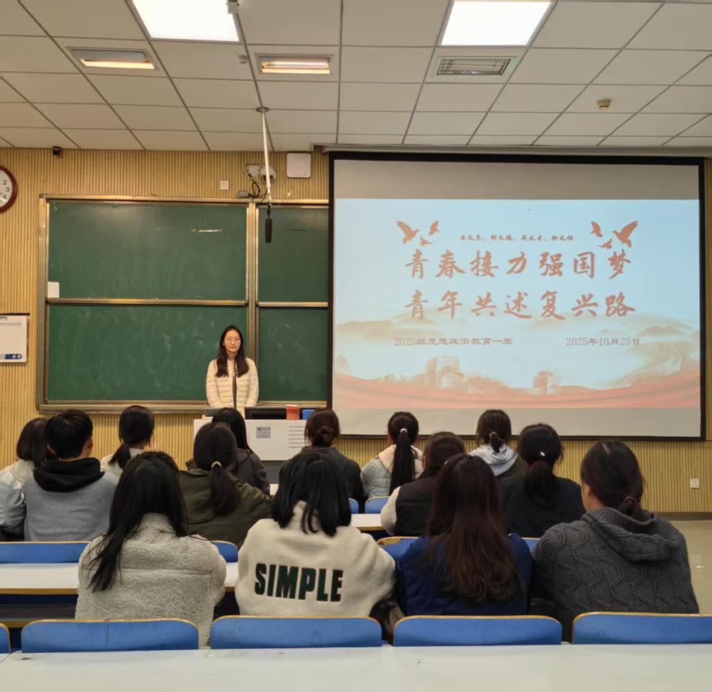 为引导青年学生将个人理想融入国家发展大局,凝聚青春奋进力量,10月23日下午,pp电子官方网站2025级思想政治教育一班于社科楼515教室开展“青春接力强国梦,青年共述复兴路”主题团课。本次团课由团支书宋晓然主持,班级全体同学参加。