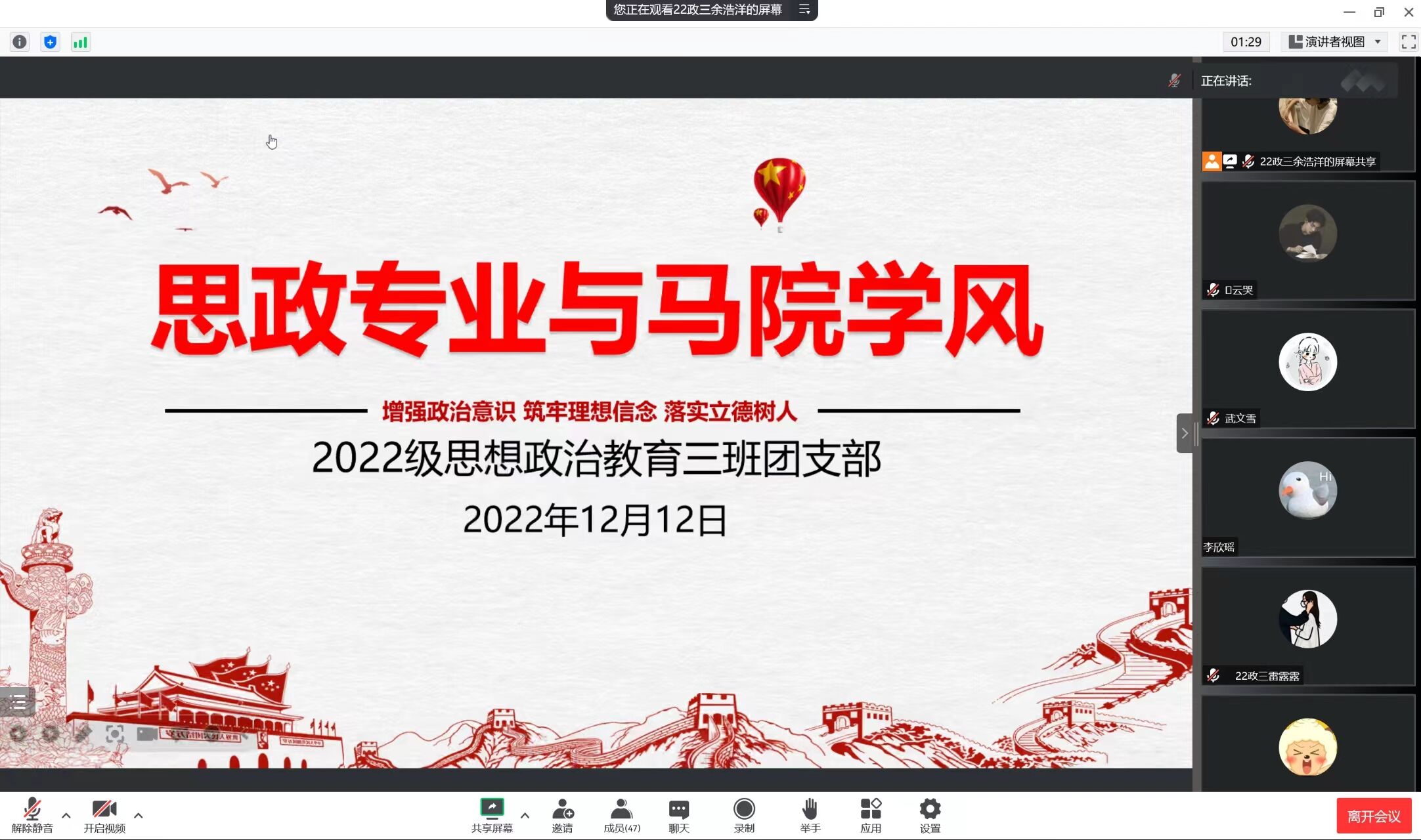 筑牢理想信念,落实立德树人。为建设创新型思政专业,打造优良的马院学风,12月12日上午,pp电子官方网站2022级思想政治教育三班在线上召开“思政专业与马院学风”主题团课。2022级思想政治教育三班全体成员共同参与团课,团课由团支书余浩洋主持。