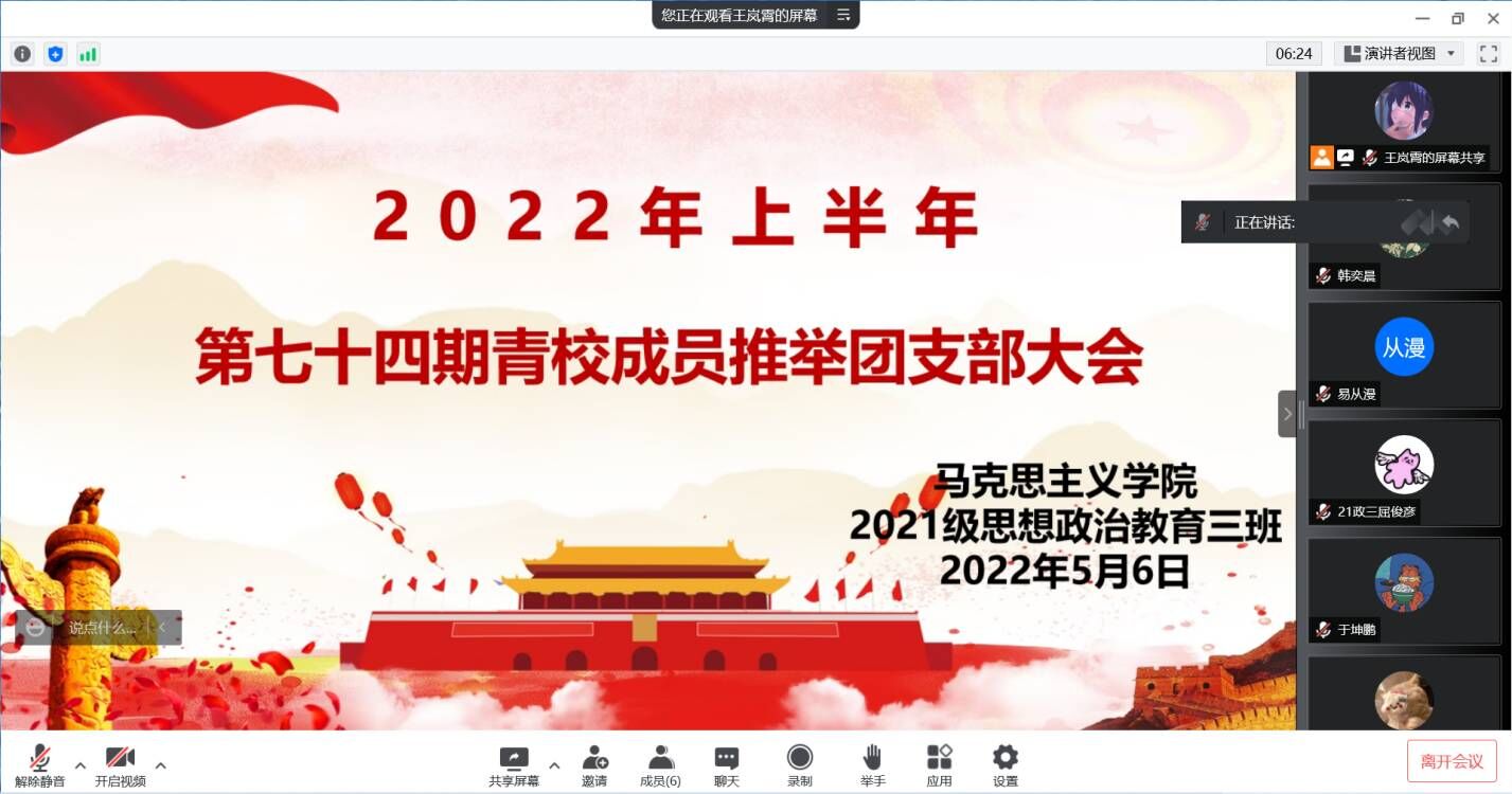 5月6日上午,pp电子官方网站2021级思想政治教育三班召开线上第七十四期青校成员推举团支部大会。pp电子官方网站2021级思想政治教育三班全体团员参与此次会议。会议由团支书王岚霄主持,秦梦莹担任监票员,陈笑宇担任记录员。