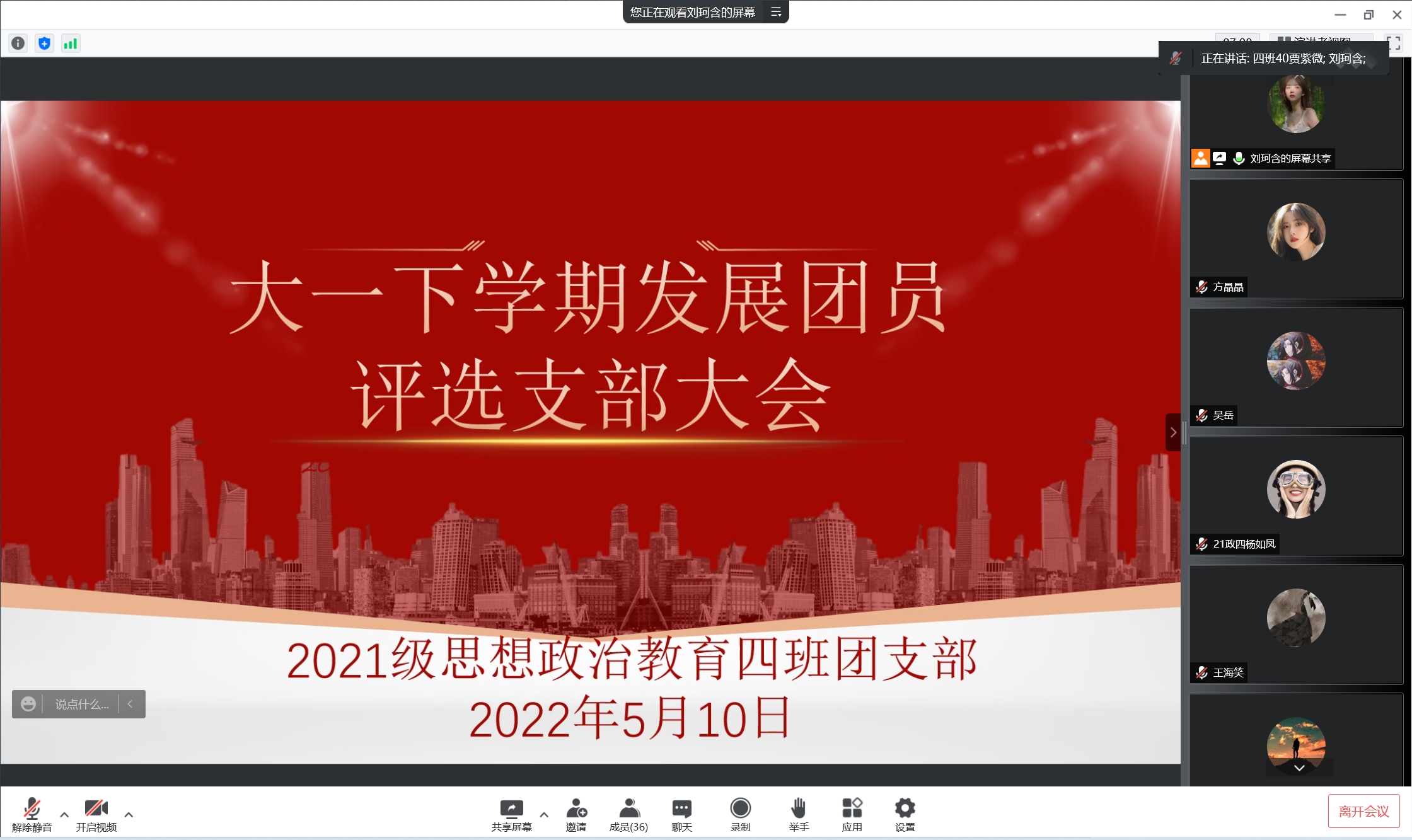 5月10日晚,pp电子官方网站2021级思想政治教育四班线上召开大一下学期发展团员民主评议会。2021级思想政治教育四班全体团员共同参会。会议由团支书刘珂含主持。
