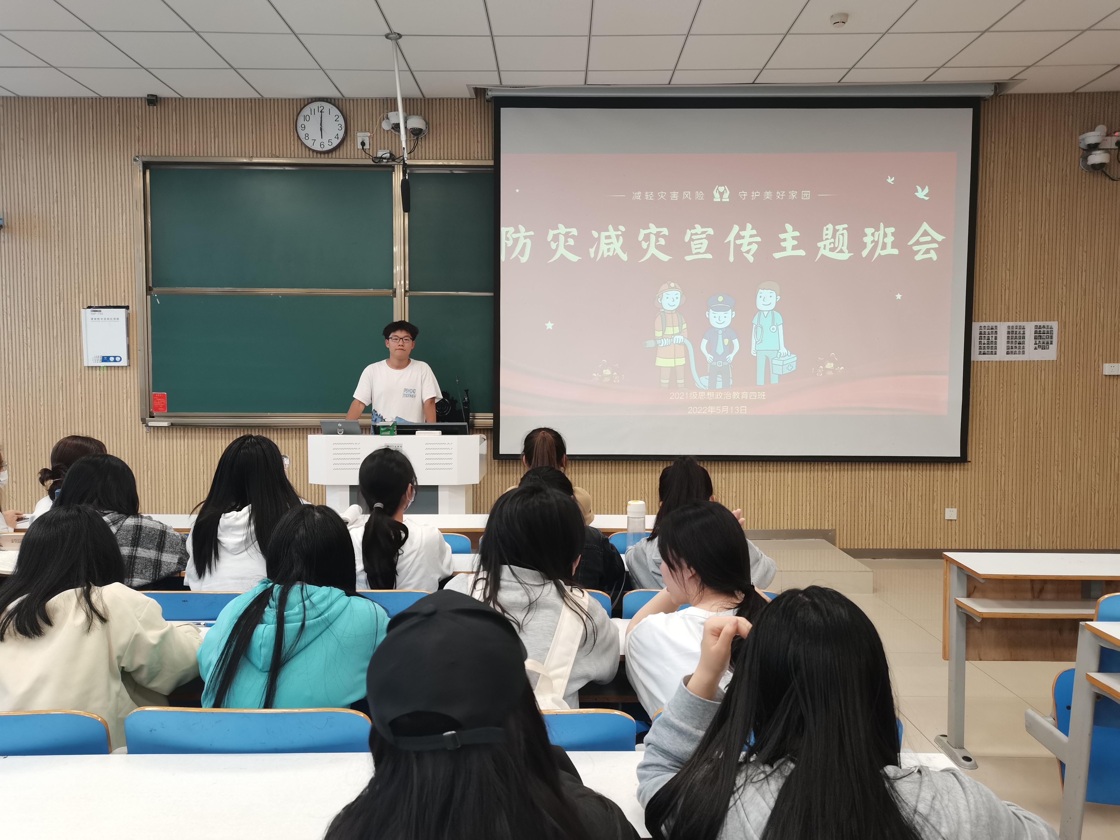 为增强同学们的防灾减灾意识,减轻自然灾害的风险,5月13日下午,pp电子官方网站2021级思想政治教育四班在社科楼515教室开展防灾减灾宣传主题班会。2021级思想政治教育四班全体同学参加本次班会。班会由副班长常康哲主持。