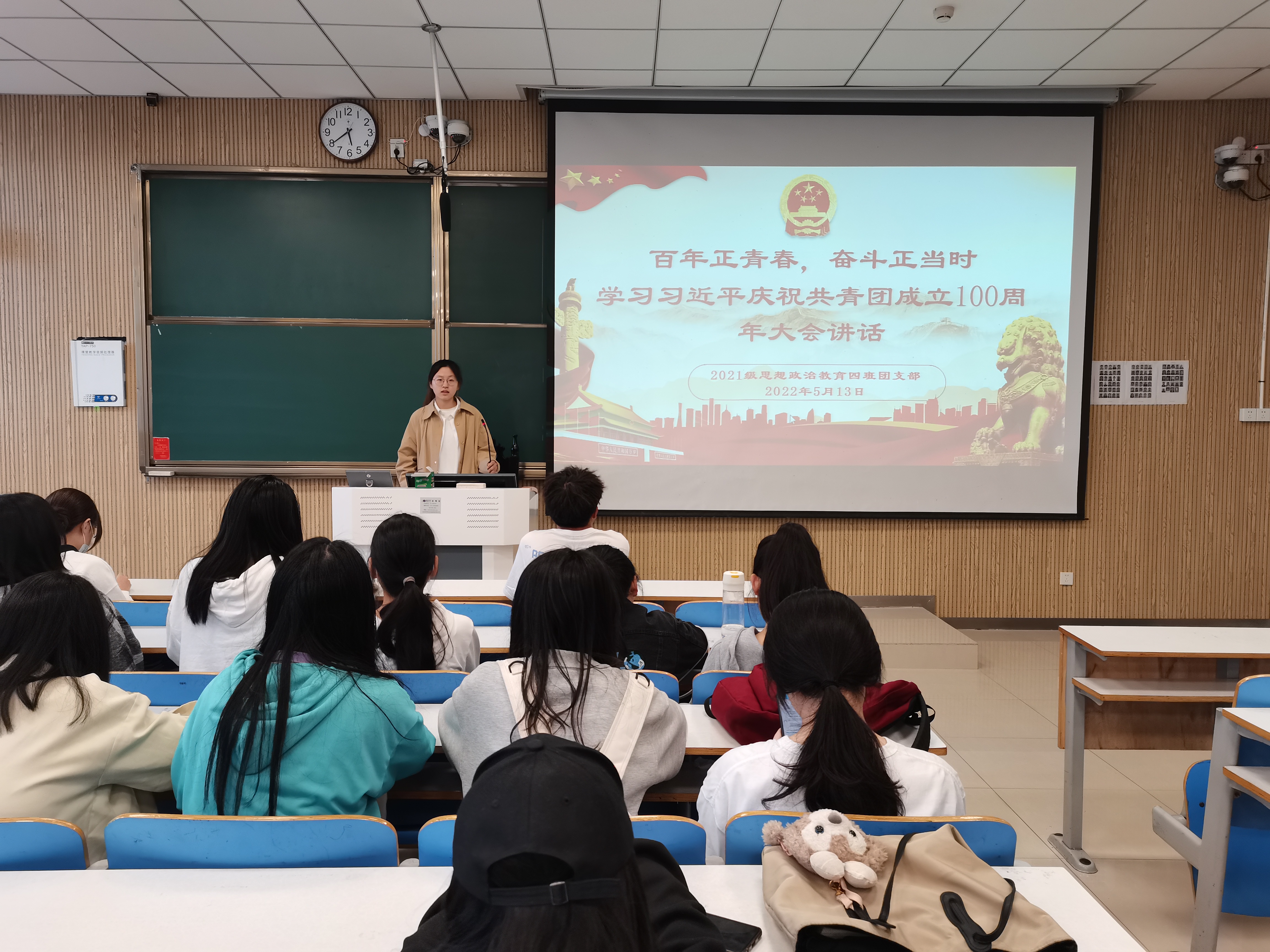 5月13日下午,pp电子官方网站2021级思想政治教育四班在社科楼515教室开展“学习习近平庆祝共青团成立100周年大会讲话”团支部大会。2021级思想政治教育四班全体团员共同参会。会议由团支书刘珂含主持。