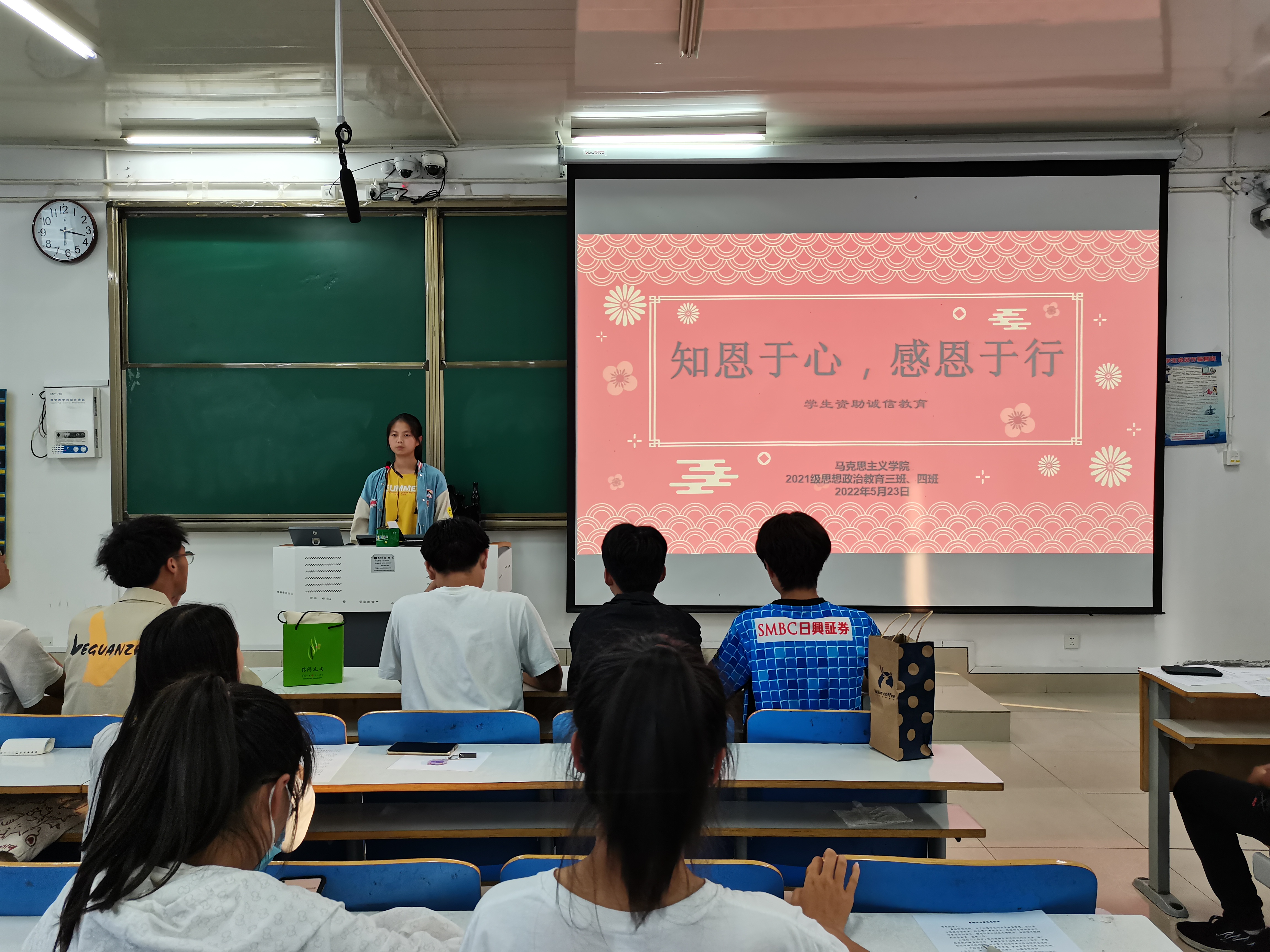 5月23日下午,pp电子官方网站2021级思想政治教育三班、四班在社科楼514教室开展“知恩于行,感恩于行”学生资助诚信教育主题班会。2021级思想政治教育三班、四班全体同学共同参会。班会由副班长易从漫主持。