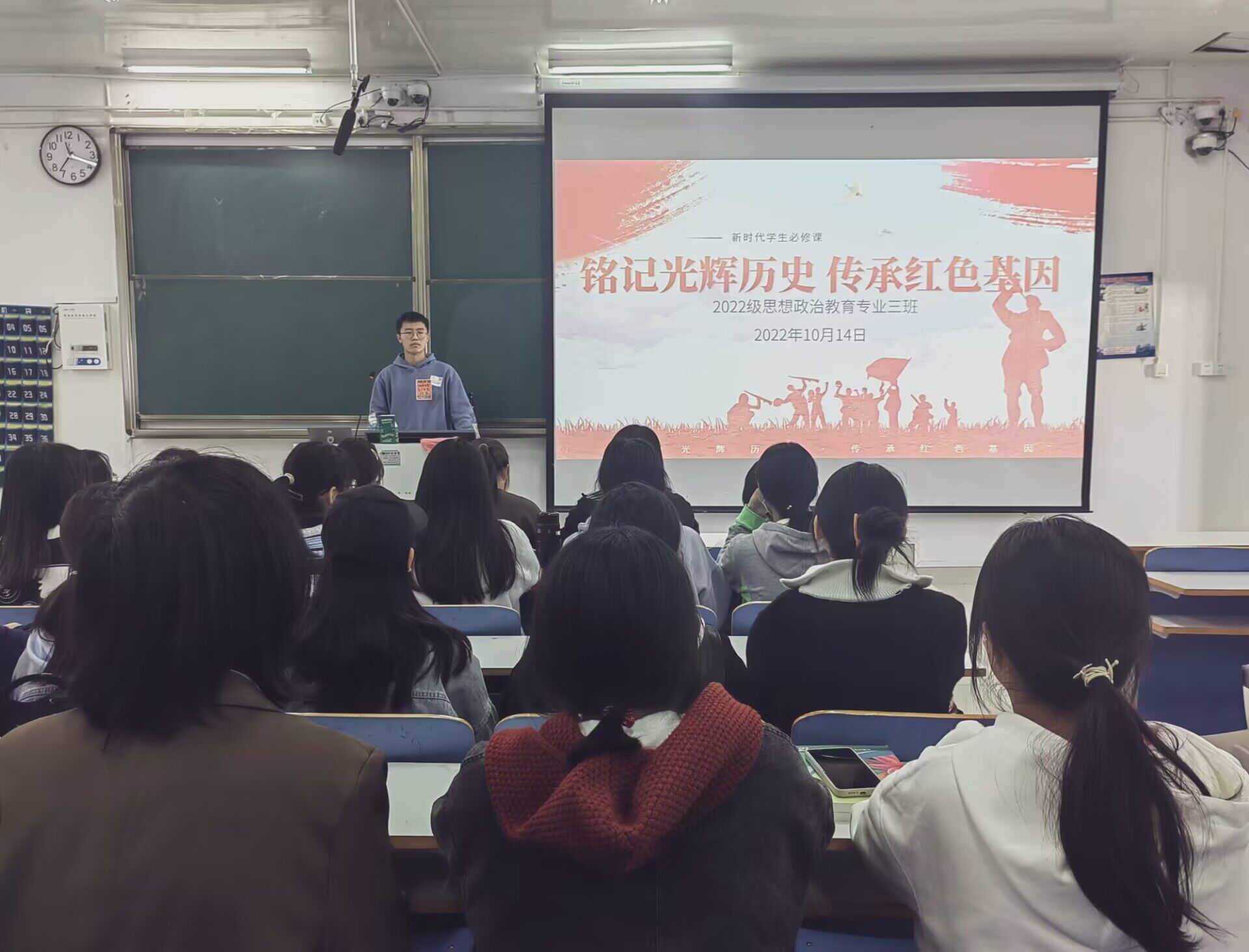 10月14日上午,pp电子官方网站2022级思想政治教育三班在社科楼514教室召开“铭记光辉历史,传承红色基因”主题班会。2022级思想政治教育三班全体成员共同参加本次班会,班会由团支书余浩洋主持。