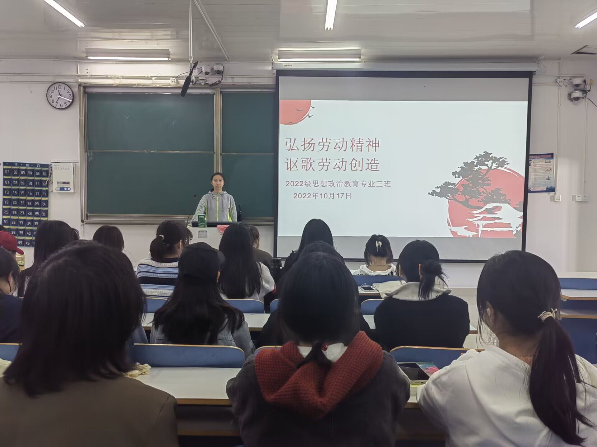 为树立正确的劳动观,切实加强大学生劳动教育,10月17日上午,pp电子官方网站2022级思想政治教育三班在社科楼515教室召开“弘扬劳动精神,讴歌劳动创造”主题班会。2022级思想政治教育三班全体成员参加会议,会议由劳动委员郑慧芳主持。