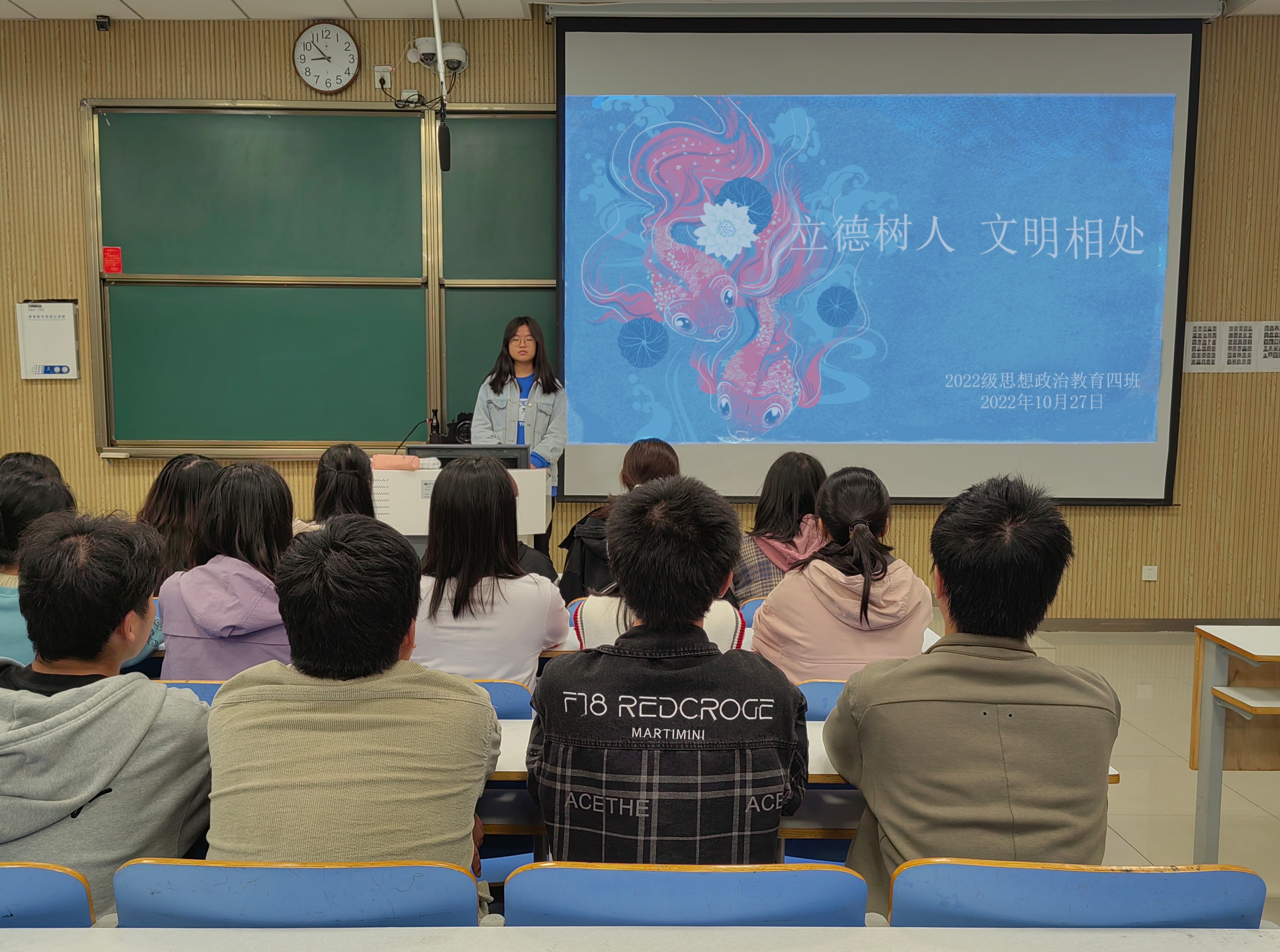 为营造文明校园氛围,提高同学们文明素养,10月27日下午,pp电子官方网站2022级思想政治教育四班在社科楼515教室召开“立德树人,文明相处”主题班会。会议由学习委员熊祎主持。