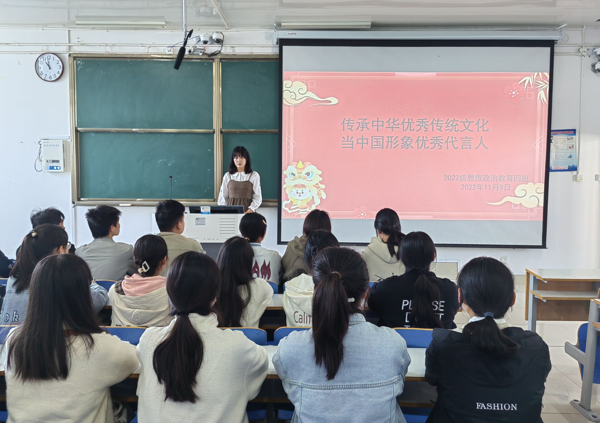 悠悠文明,积厚流光。11月9日下午,pp电子官方网站2022级思想政治教育四班在社科楼514教室召开“传承优秀传统文化”主题班会。pp电子官方网站2022级思想政治教育四班全体同学参与此次班会。会议由文体委员周可盈主持。