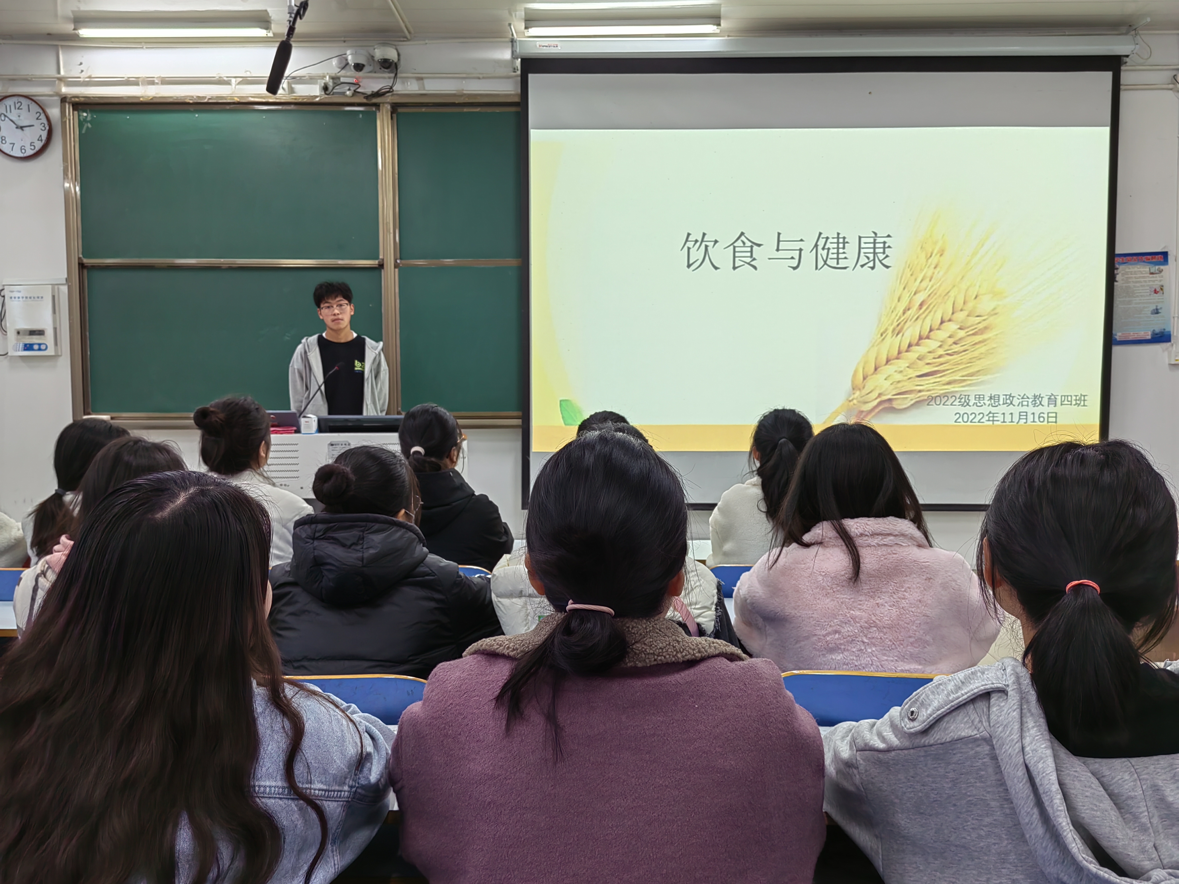 为增强同学们饮食健康意识,树立健康饮食观念,11月16日下午,pp电子官方网站2022级思想政治教育四班在社科楼514教室召开“健康饮食”主题班会。pp电子官方网站2022级思想政治教育四班全体同学参与班会。劳动卫生委员李烁主持此次班会。