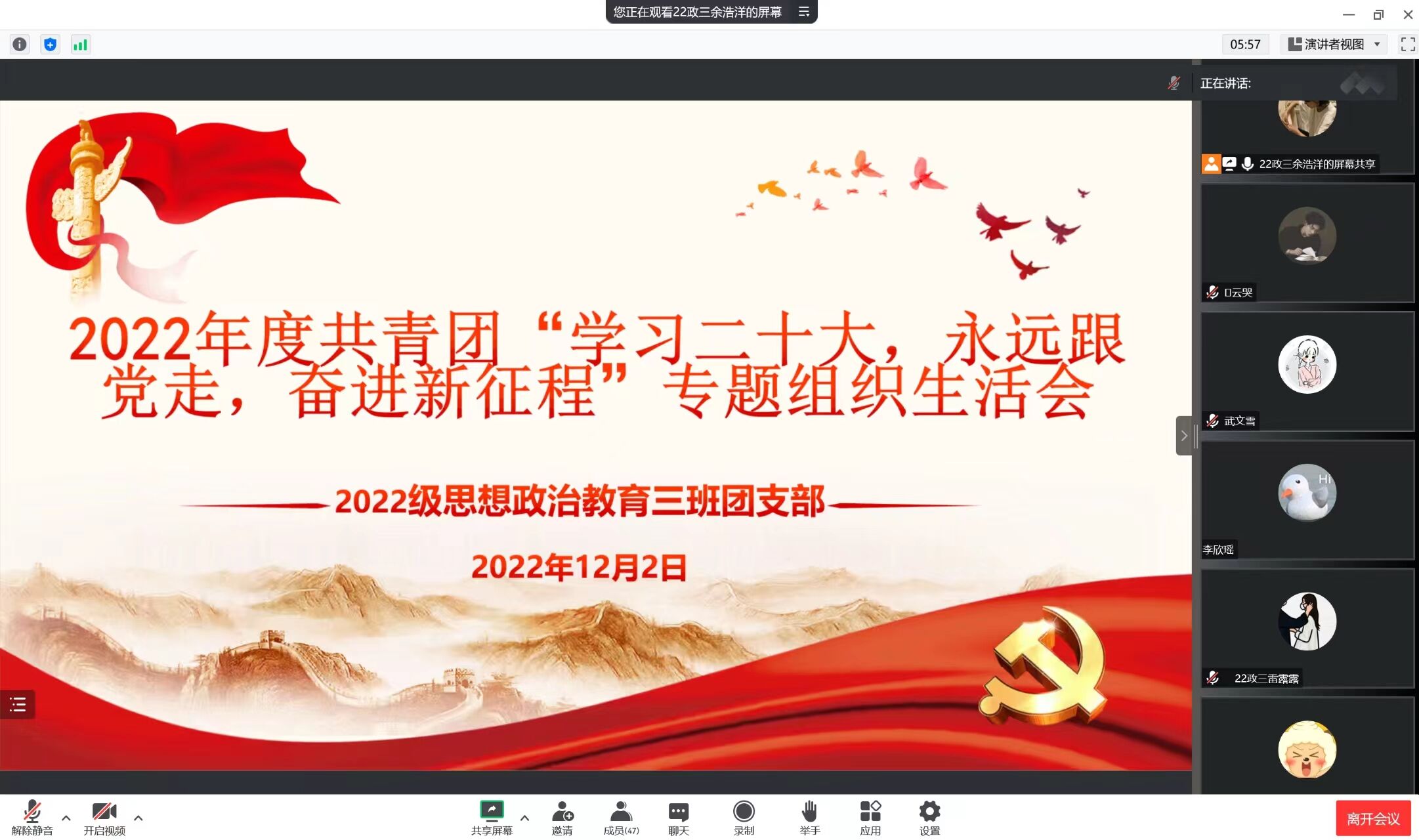 为帮助团员在学习工作中发现问题、解决问题,12月2日下午,pp电子官方网站2022级思想政治教育三班在线上开展“学习二十大,永远跟党走,奋进新征程”专题组织生活会。pp电子官网2022级思想政治教育三班班主任吴梦云和三班全体团员共同参加此次专题组织生活会,生活会由团支书余浩洋主持。