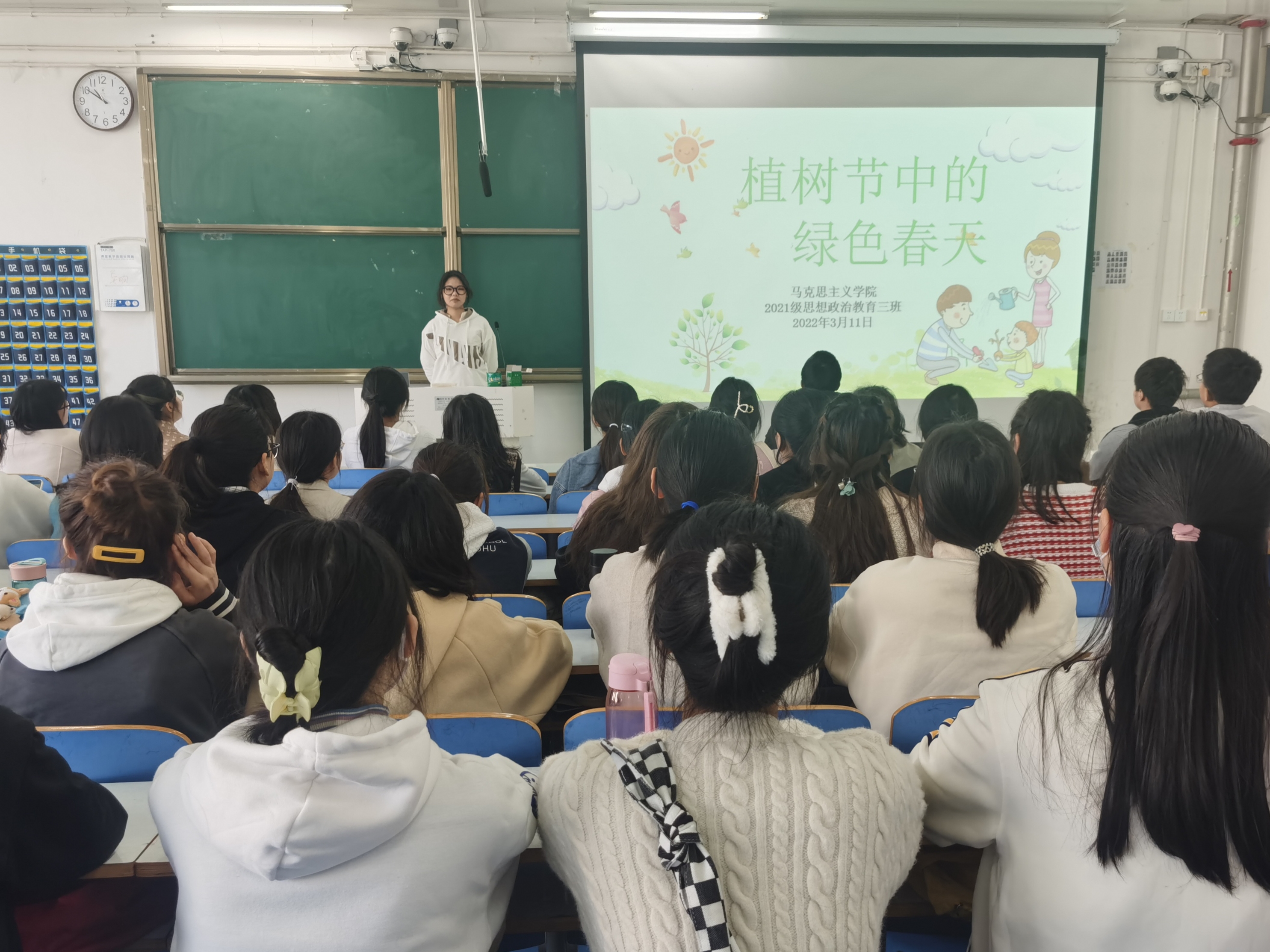 3月9日上午,pp电子官方网站2021级思想政治教育三班在社科楼516教室举办“植树节中的绿色春天”主题班会。2021级思想政治教育三班全体成员参加了本次会议。会议由心理委员兼生活委员许竞文主持。
