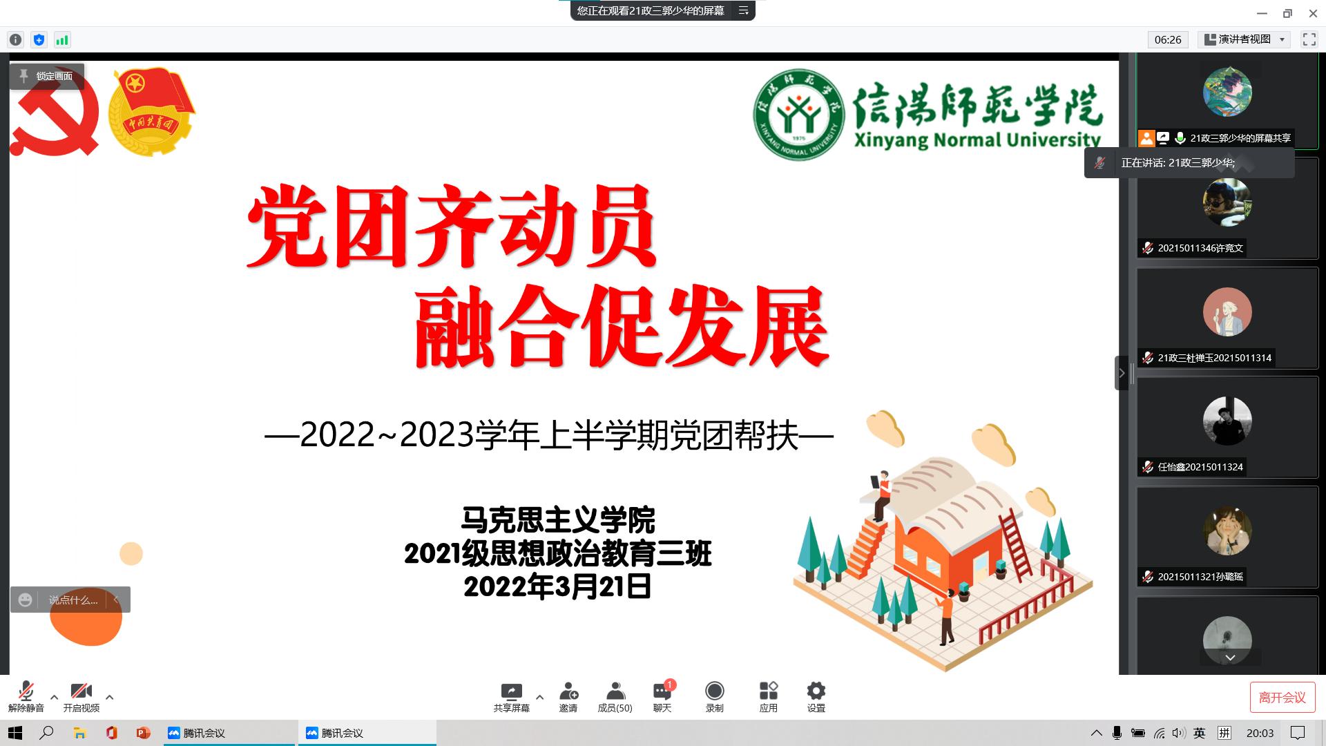 3月21日晚上,pp电子官方网站2021级思想政治教育三班开展线上“党员齐动员,融合促发展”党团帮扶活动。辅导员高小佳、2019级思想政治教育一班正式党员李梦琦、2019级思想政治教育二班正式党员杨煦华以及2021级思想政治教育三班全体团员参加了此次活动。活动由团支书郭少华主持。