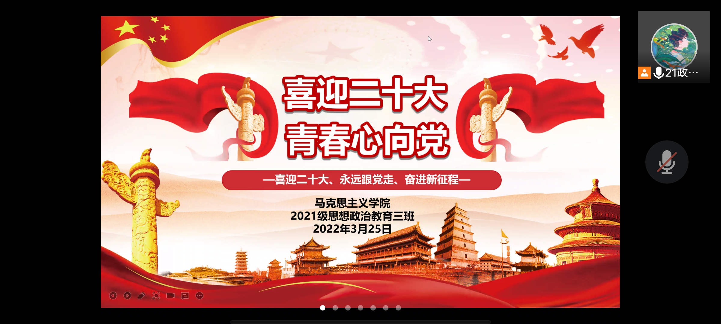 3月25日中午,pp电子官方网站2021级思想政治教育三班召开线上“喜迎二十大,青春心向党”主题团课,2021级思想政治教育三班全体团员参加此次团课,团课由团支书郭少华主持。