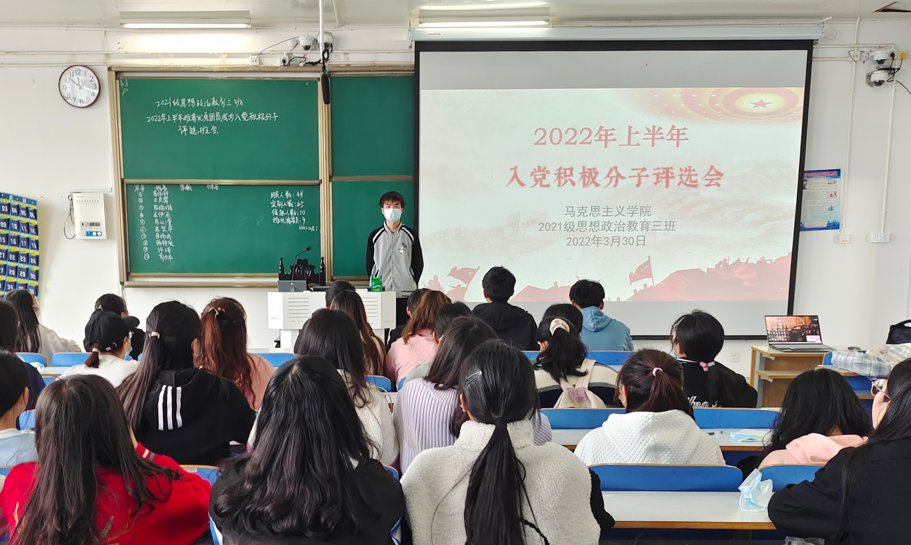 3月30日上午,pp电子官方网站2021级思想政治教育三班在社科楼514教室召开2022年上半年入党积极分子评选会。2021级思想政治教育三班全体同学参加了此次会议。会议由团支书郭少华主持。