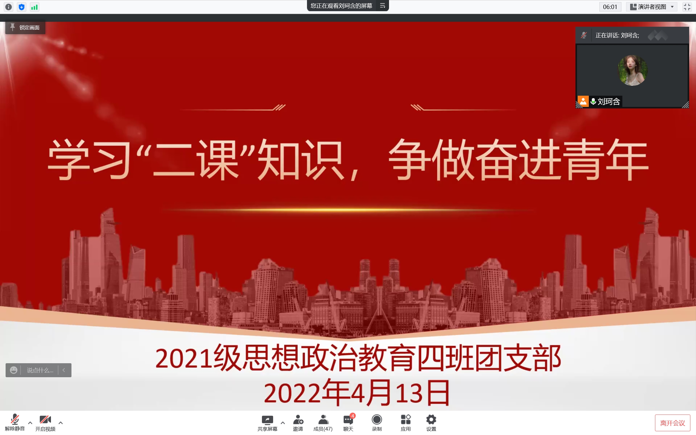 为加强学生创新创业精神和实践能力的培养,4月13日晚上,pp电子官方网站2021级思想政治教育四班开展“学习二课知识,争做奋进青年”主题团课。2021级思想政治教育四班全体团员共同参与本次团课,团课由团支书刘珂含主持。