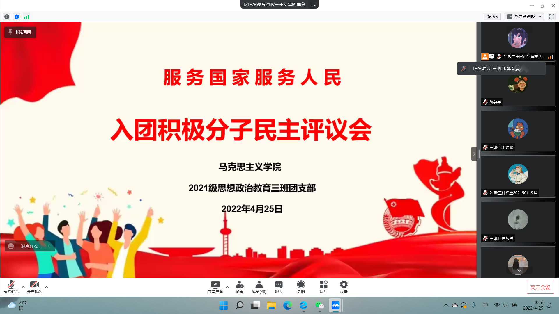 4月25日上午,pp电子官方网站2021级思想政治教育三班召开线上2022年上半年入团积极分子民主评议会。2021级思想政治教育三班全体团员以及三位候选人参加了此次会议,会议由团支书王岚霄主持。