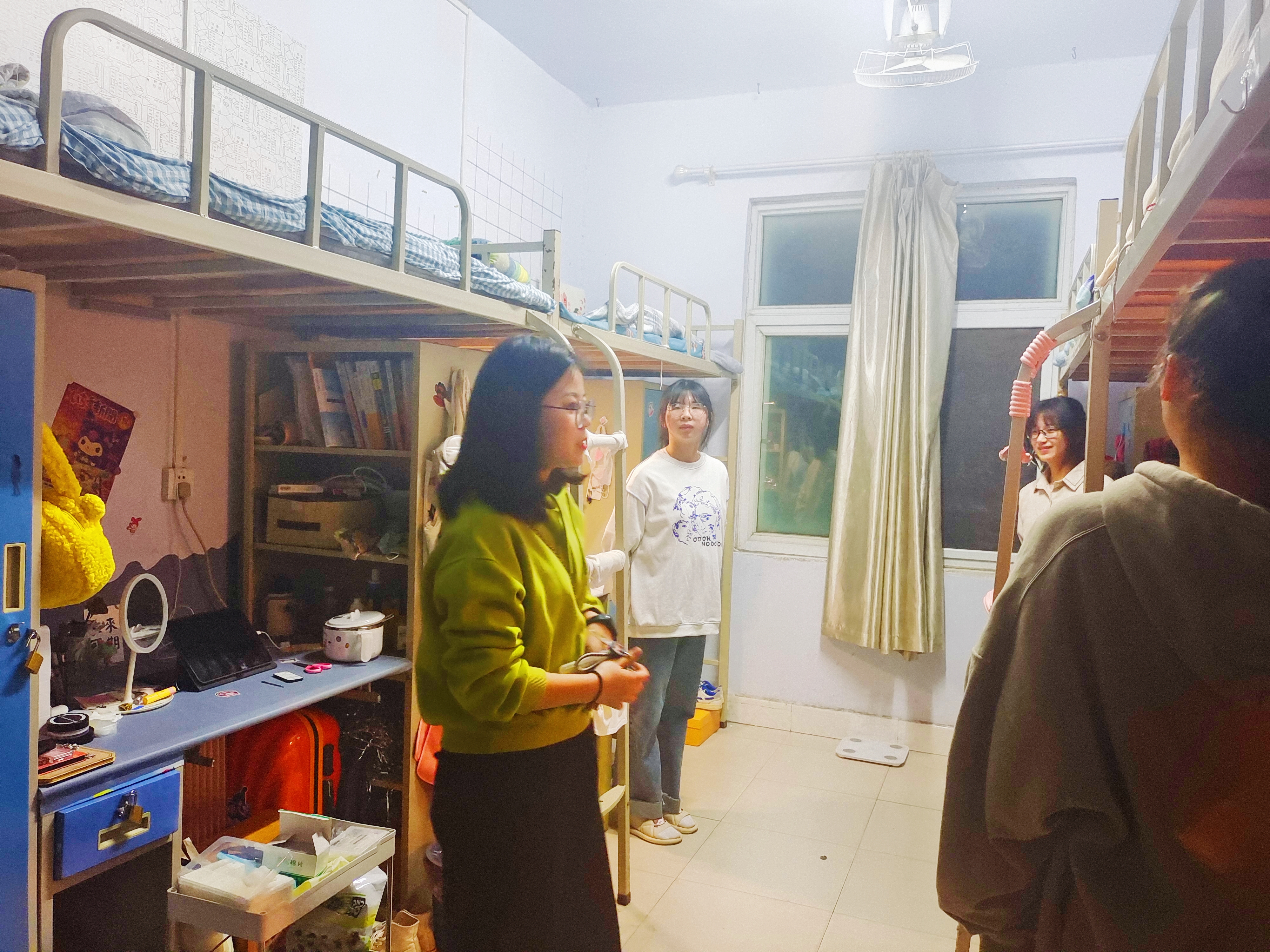 高小佳先后前往女生和男生寝室,按照楼层逐个走访学生寝室。她对同学们周末生活安排以及学习状况进行进一步的了解,为大家充实课余生活提出建议,并再次叮嘱大家重视疫情防控,及时开窗通风等。走访期间,她对部分卫生状况明显改观的寝室提出表扬,并鼓励大家维持良好的居住环境。随后,高小佳对寝室长们提出,要继续做好疫情封校期间对本寝室同学心理健康问题的排查,鼓励大家积极参加活动,多运动,同时可以以寝室为单位进行交流学习,做到劳逸结合。