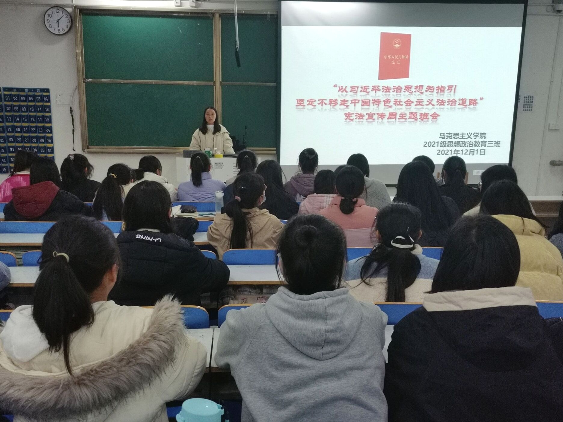 12月1日下午,pp电子官方网站2021级思想政治教育三班宪法宣传周主题班会在社科楼516教室召开。2021级思想政治教育三班全体同学参加此次班会,班会由副班长王岚霄主持。