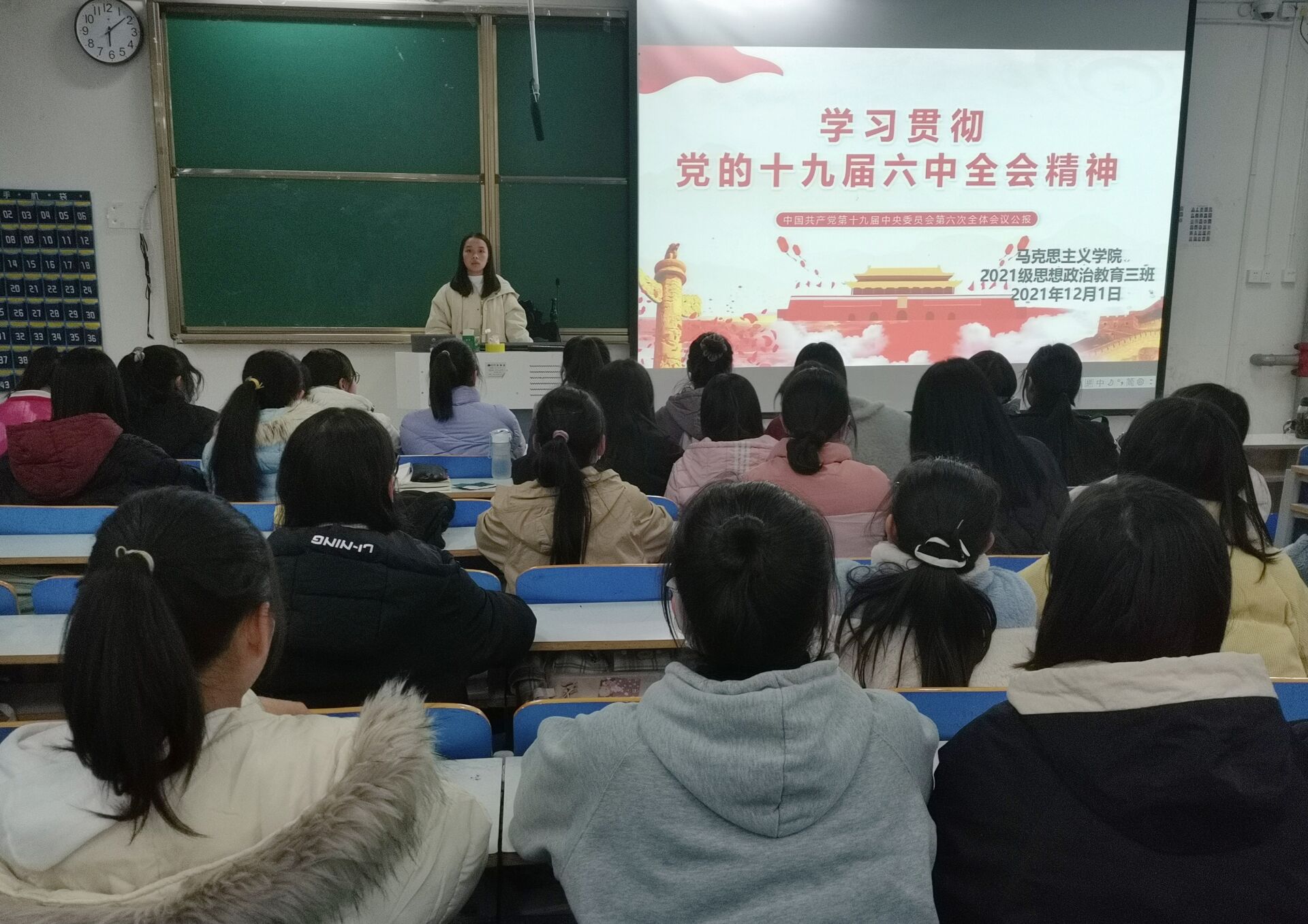 12月1日下午,pp电子官方网站2021级思想政治教育三班在社科楼516召开学习党的十九届六中全会精神主题班会。2021级思想政治教育三班全体成员参加本次班会。班会由副班长王岚霄主持。