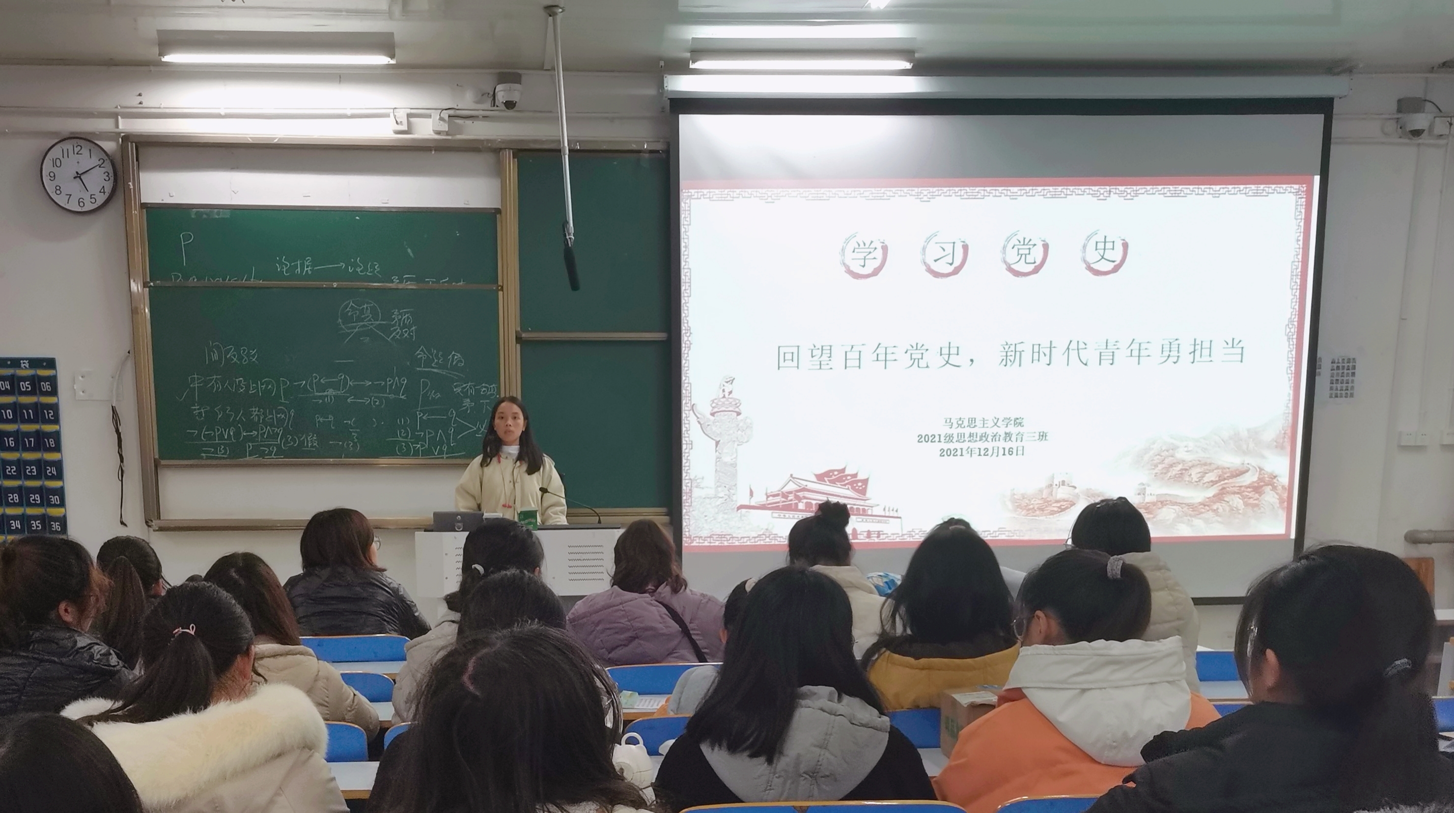 12月16日下午,pp电子官方网站2021级思想政治教育三班在社科楼514教室举办“回望百年党史,新时代青年勇担当”主题团课。2021级思想政治教育三班全体团员参加了此次团课。团课由团支部副书记王岚霄主持。