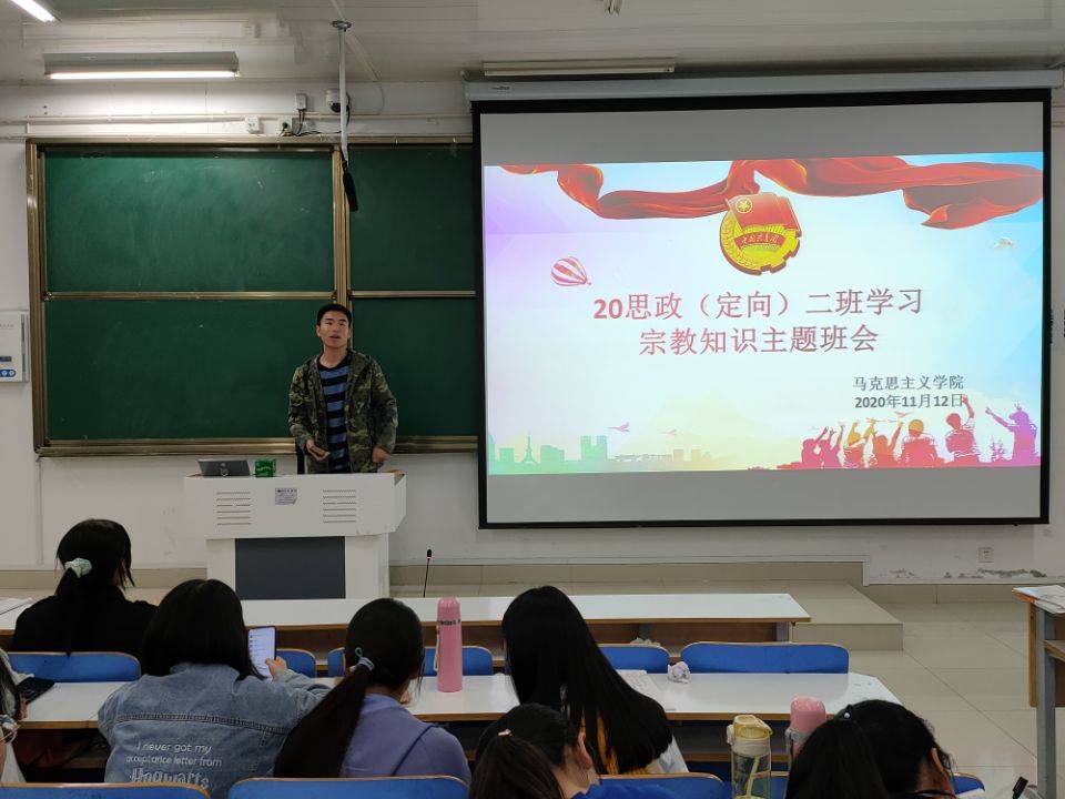 11月12日,pp电子官方网站思想政治教育定向二班学习宗教知识主题班会在社科楼514教室顺利召开。班会由副班长高红凯主持。