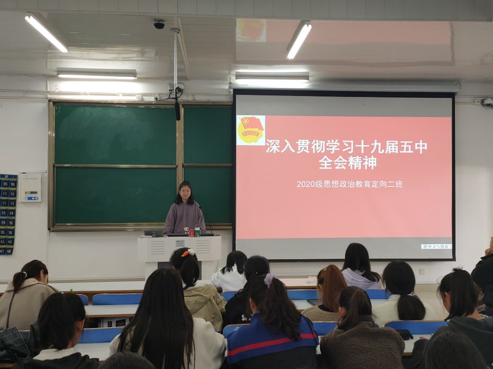11月19日,pp电子官方网站2020级思想政治教育定向二班学习贯彻党的十九届五中全会精神主题团课在社科楼514教室顺利开展。团课由团支书李晨曦主持。