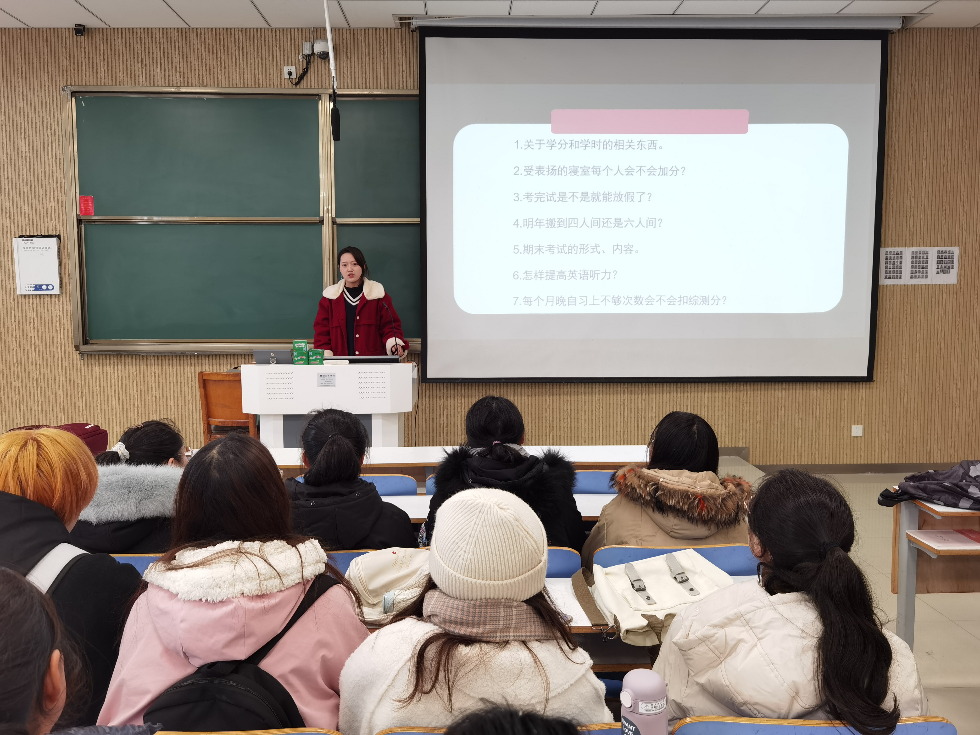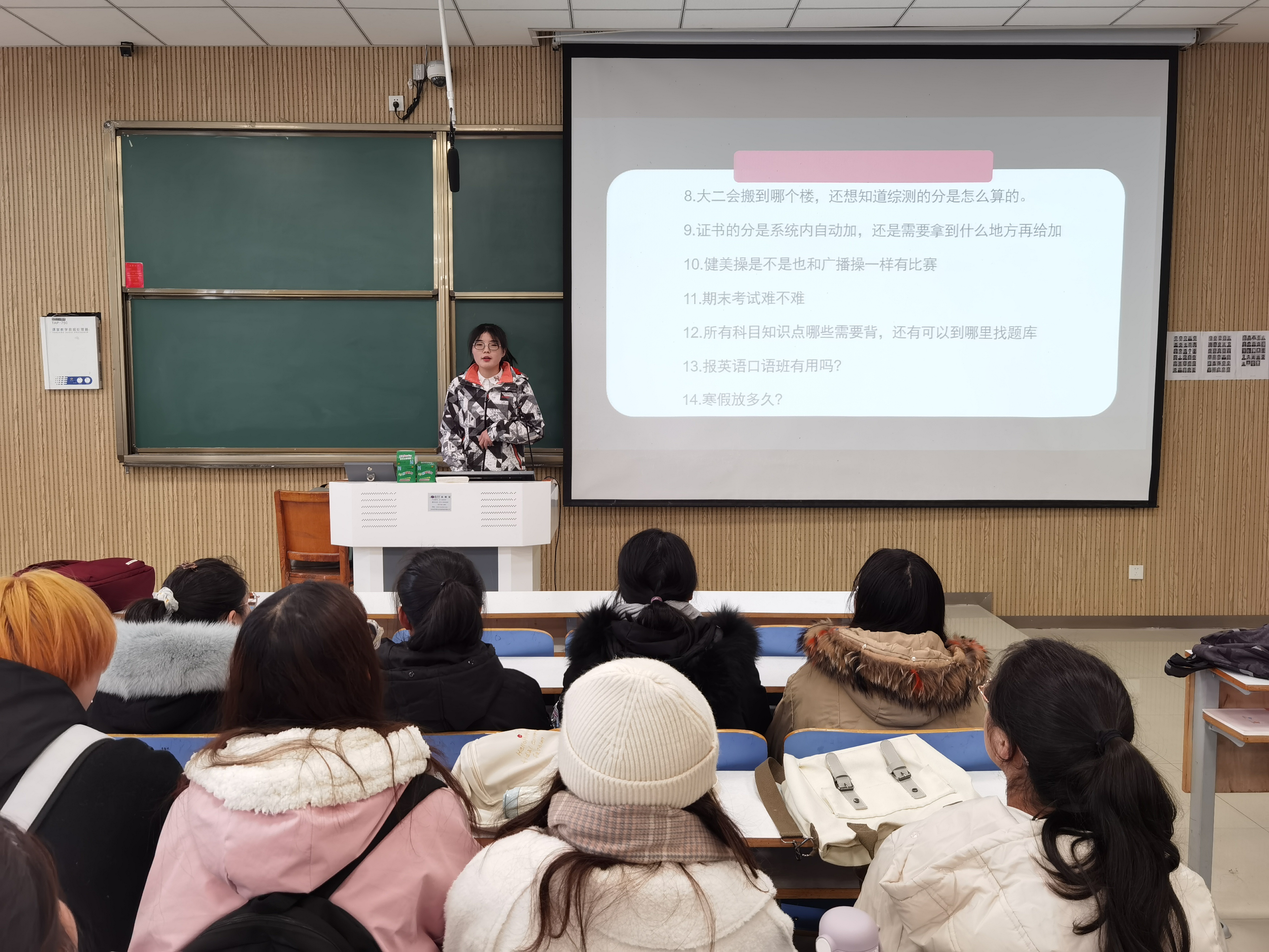 首先,陈宇航代表全体学生提出同学们近期在学习与生活上遇到的问题。随后,黄子晋、王文慧结合自身学习与生活经验,依次解答同学们的问题。其中,黄子晋悉心解答了有关第二课堂、住宿环境、考试形式几个方面的问题。她提出,同学们要认真学习本专业知识,提高自身专业素养,积极参加社团活动,培养个人综合素质和修养。王文慧从课程重点、英语口语、假期规划三个方面具体回答了同学们的问题,她建议同学们要多与学长学姐们沟通交流学习经验,充分利用英语学习软件提高英语水平,放假期间制定好学习计划,养成良好的学习与生活习惯。最后,陈宇航对本次活动做出总结,希望同学们根据以上意见和建议,合理规划大学学习与生活计划,并对黄子晋、王文慧的热心解答表示感谢。