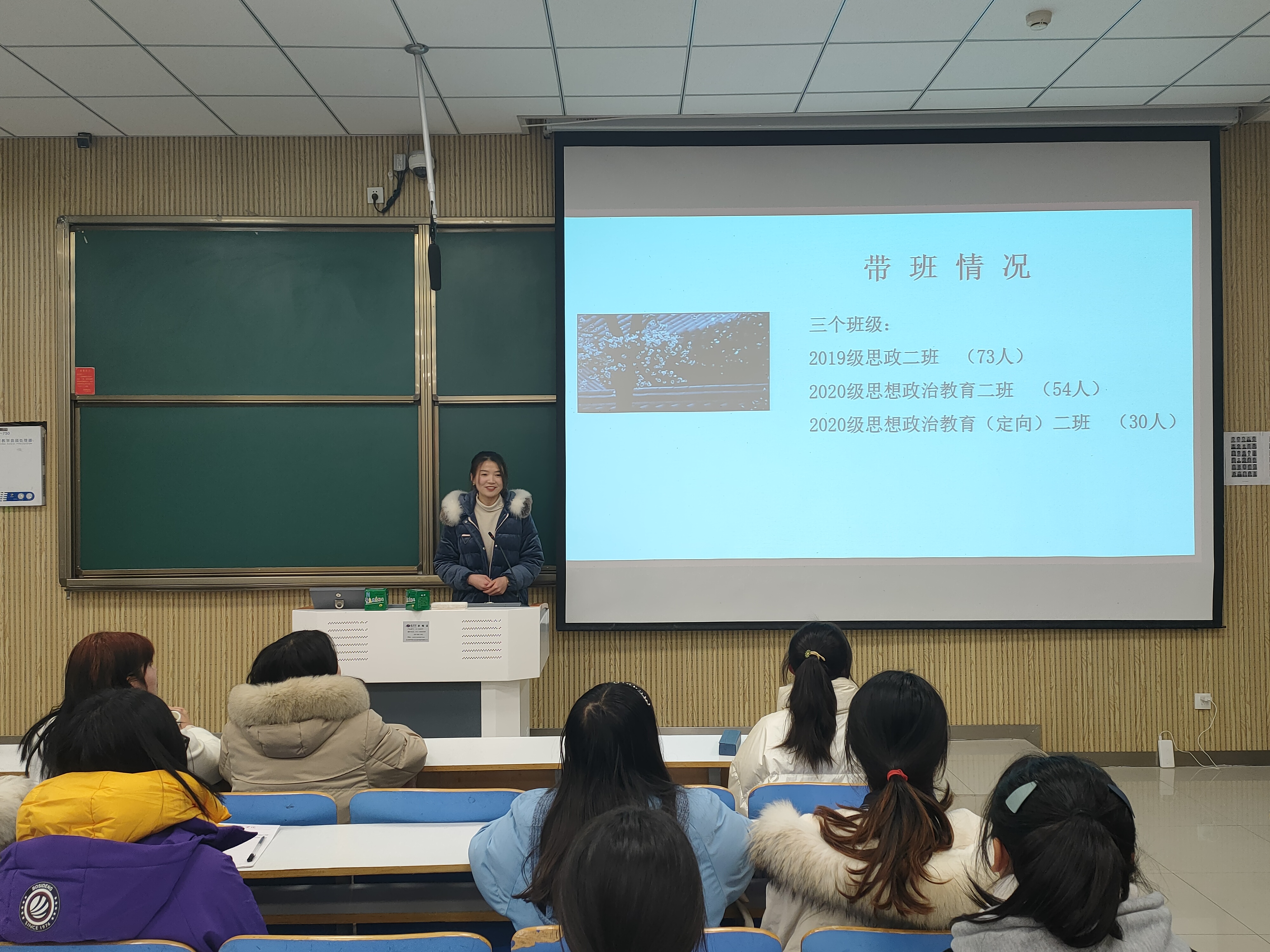 为考查教师对班级学生基本信息的了解情况,12月18日,pp电子官方网站2020级思想政治教育定向二班班情熟知主题班会在社科楼515教室顺利召开。班主任陶青青以及定向二班全体同学共同参与本次班会。大学生心理健康中心袁占阳老师莅临现场指导,pp电子官网团委老师曹菁菁到现场观摩。