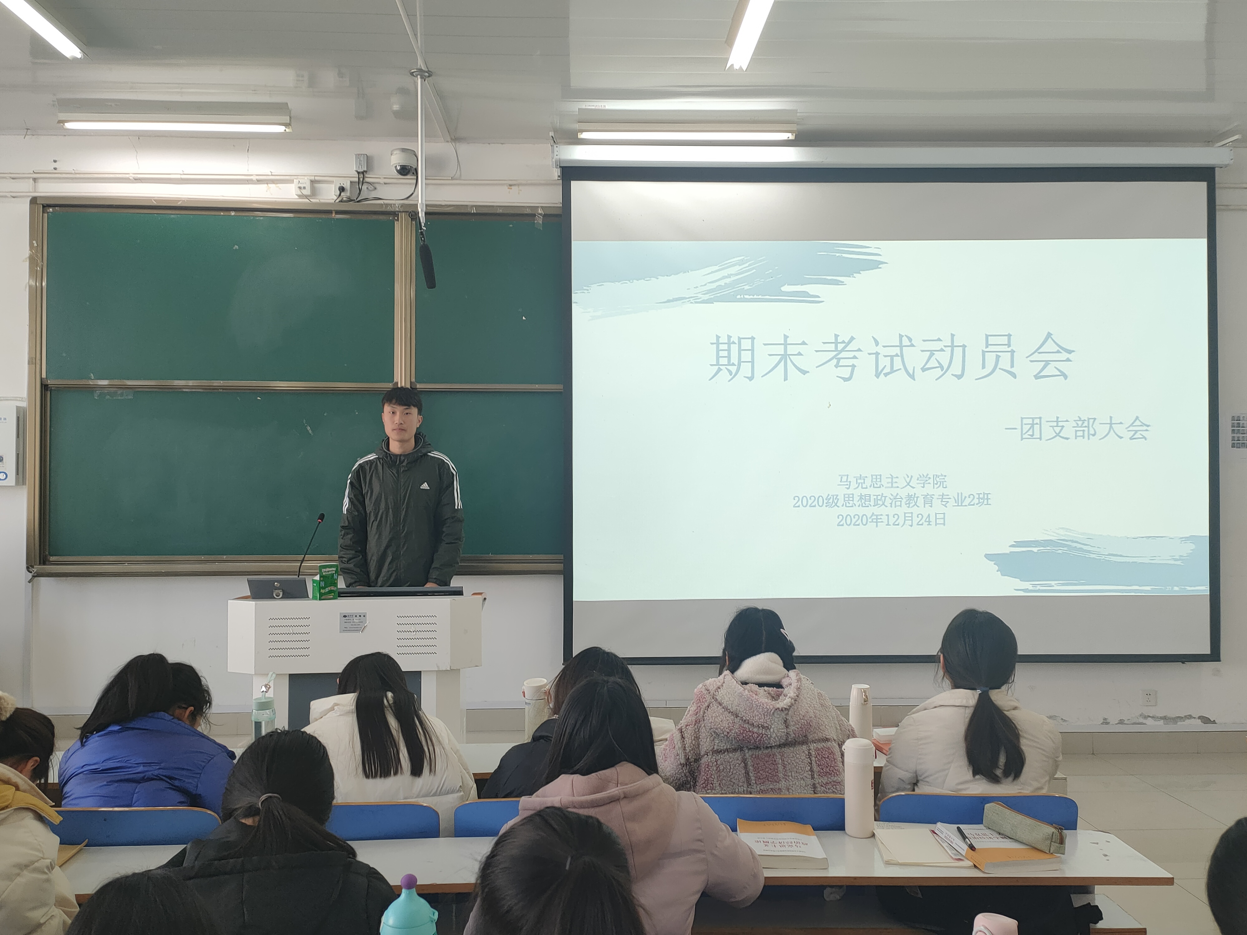 12月24日上午,pp电子官方网站2020级思想政治教育二班、(定向)二班在社科楼516教室顺利召开期末考试动员会。2020级思想政治教育二班、(定向)二班全体学生共同参与此次会议。会议由李晨曦、陈宇航主持。