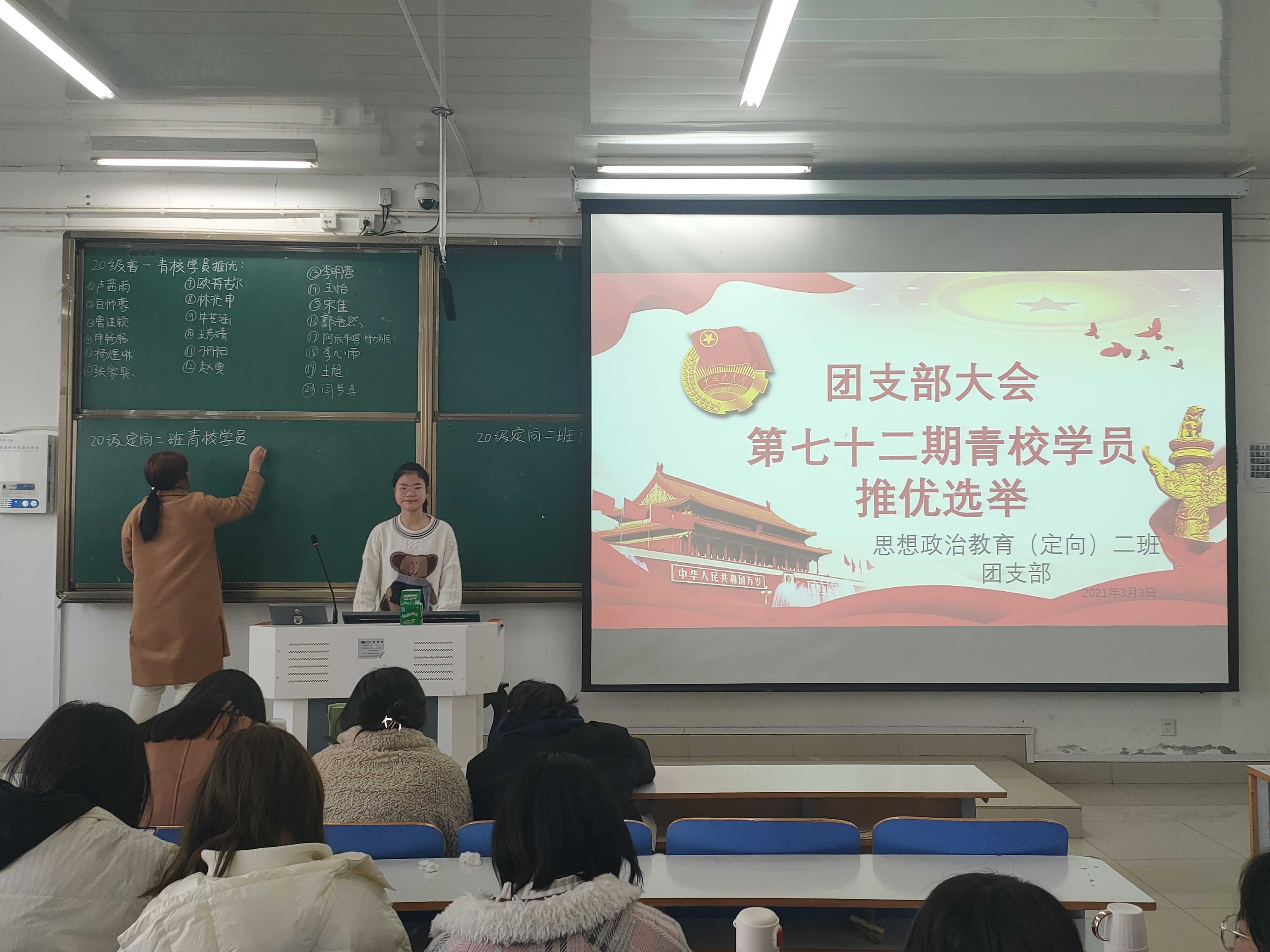 3月3日下午,pp电子官方网站2020级思想政治教育定向二班第72期青校学员推优选举团支部大会在社科楼516教室顺利召开。