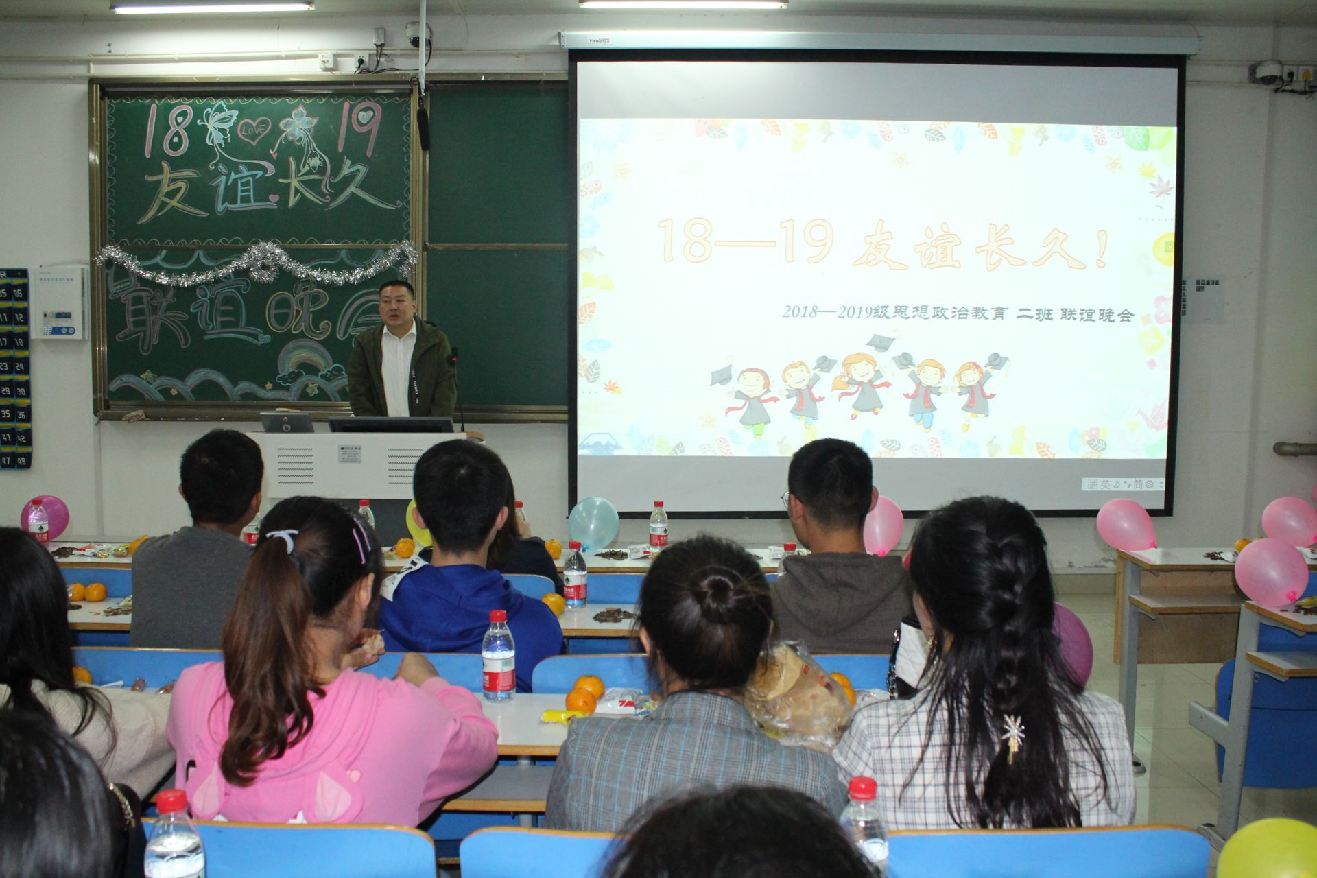 10月20日晚,pp电子官方网站“18、19友谊长久”思想政治教育二班联谊晚会在社科楼516教室隆重举行。pp电子官方网站党委副书记何晓坚、团委老师陶青青及2018、2019级思政二班全体学生共同观看了本场晚会。晚会由张靖茹、吕昂主持。