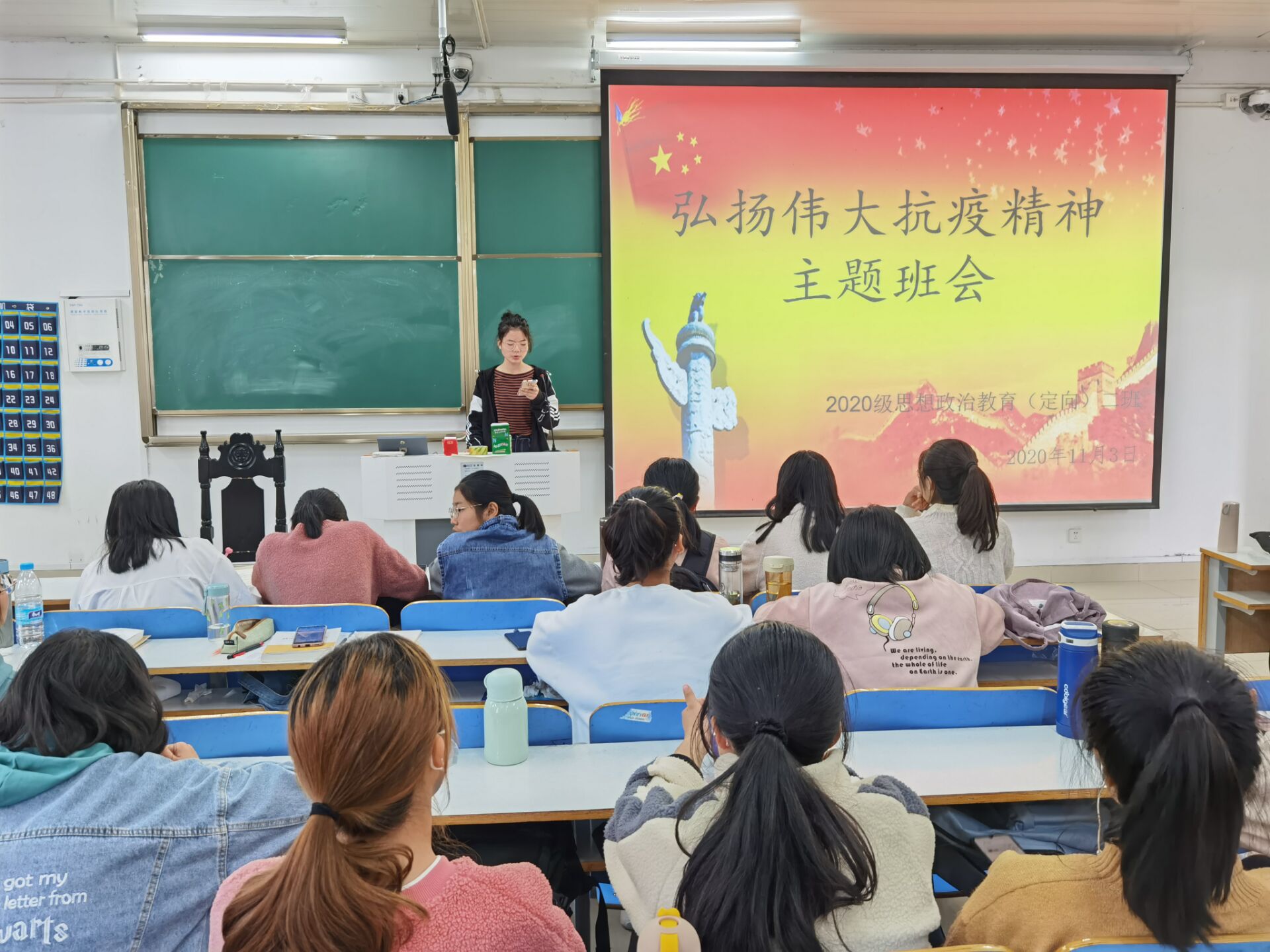 为大力弘扬伟大抗疫精神、激发学生的爱国热情,11月3日上午,pp电子官方网站2020级思想政治教育定向二班在社科楼514教室召开了“弘扬伟大抗疫精神”主题班会。班会由团支书李晨曦主持。