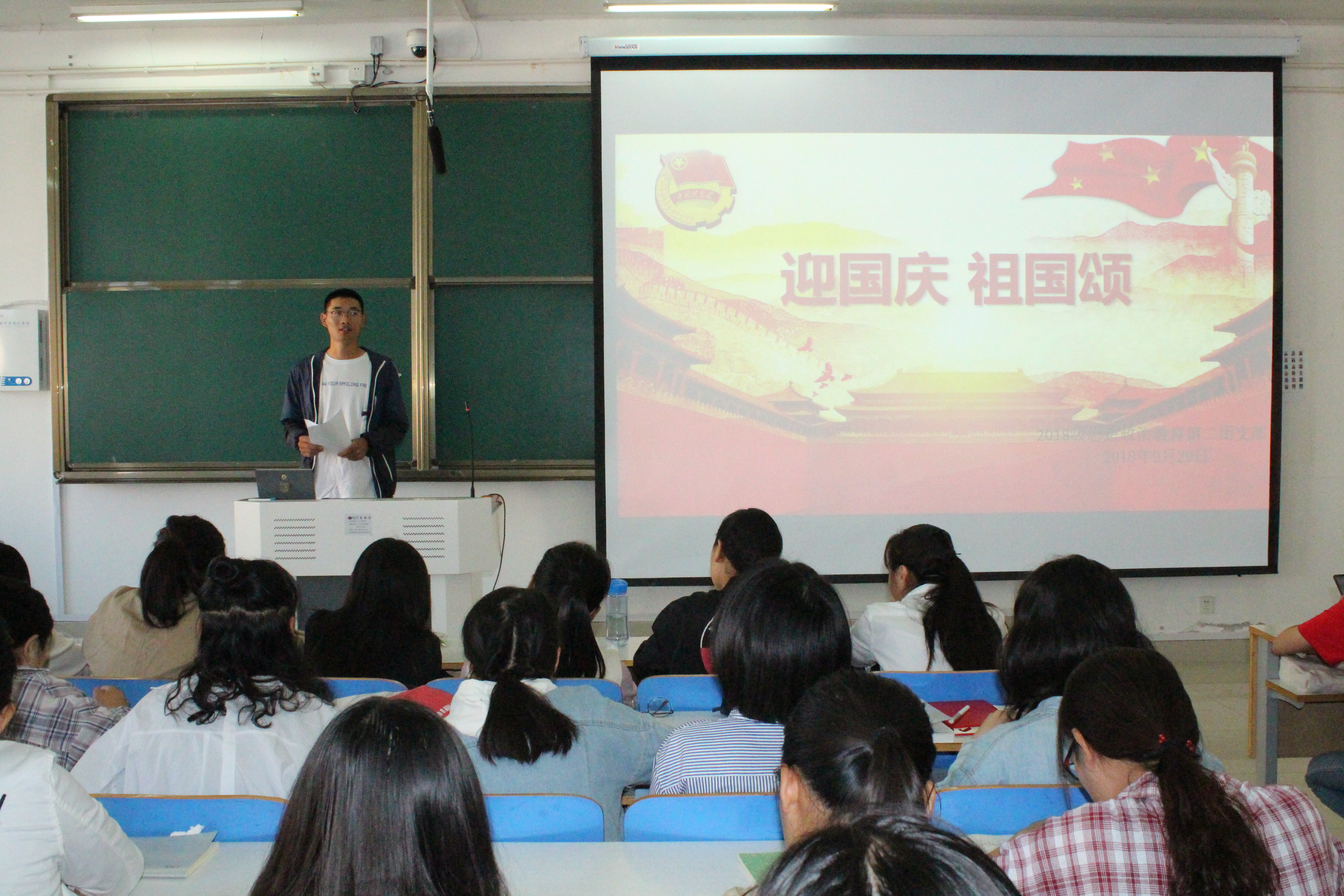 为纪念祖国成立69周年,激发pp电子官网学子爱国热情,9月29日上午,pp电子官方网站2018级第二团支部召开“迎国庆、祖国颂”的主题班会。pp电子官网2018级思想政治教育二班全体学生共同参加了本次班会。班会由班长杨康主持。