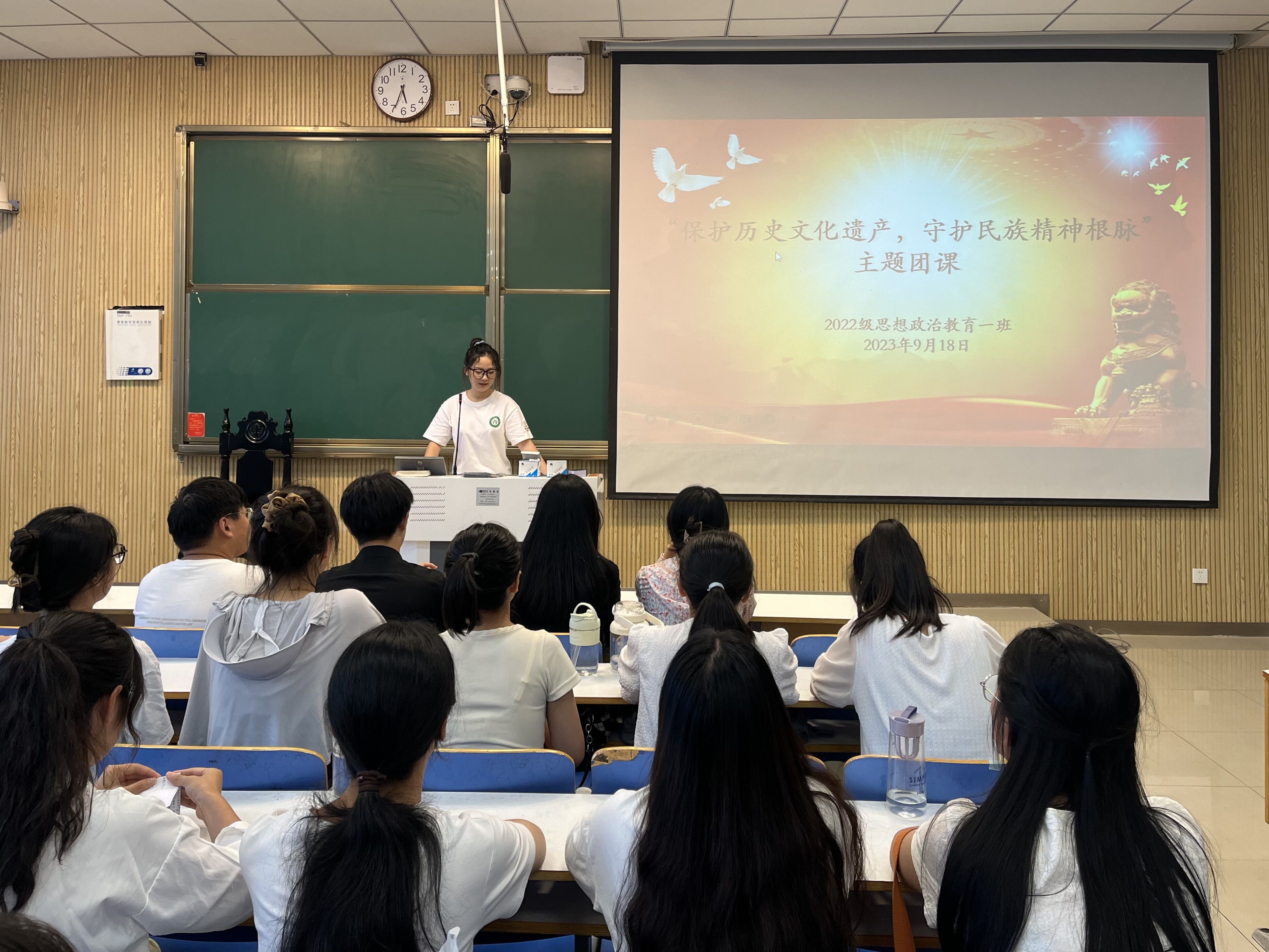 9月18日下午,pp电子官方网站2022级思想政治教育一班在社科楼514教室召开“保护历史文化遗产,守护民族精神根脉”主题团课。pp电子官网2022级思想政治教育一班全体同学共同参与本次团课,团课由团支书李佳茹主持。