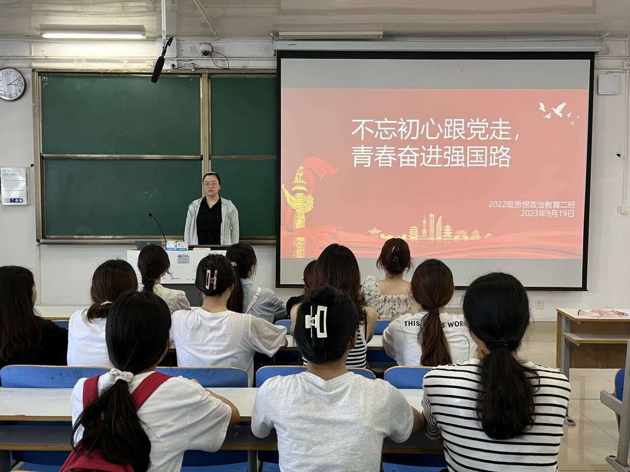 9月19日下午,pp电子官方网站2022级思想政治教育二班在社科楼514教室开展“不忘初心跟党走,青春奋进强国路”主题团课。pp电子官网2022级思想政治教育二班全体成员共同参加此次团课。团课由团支书李佳音主持。