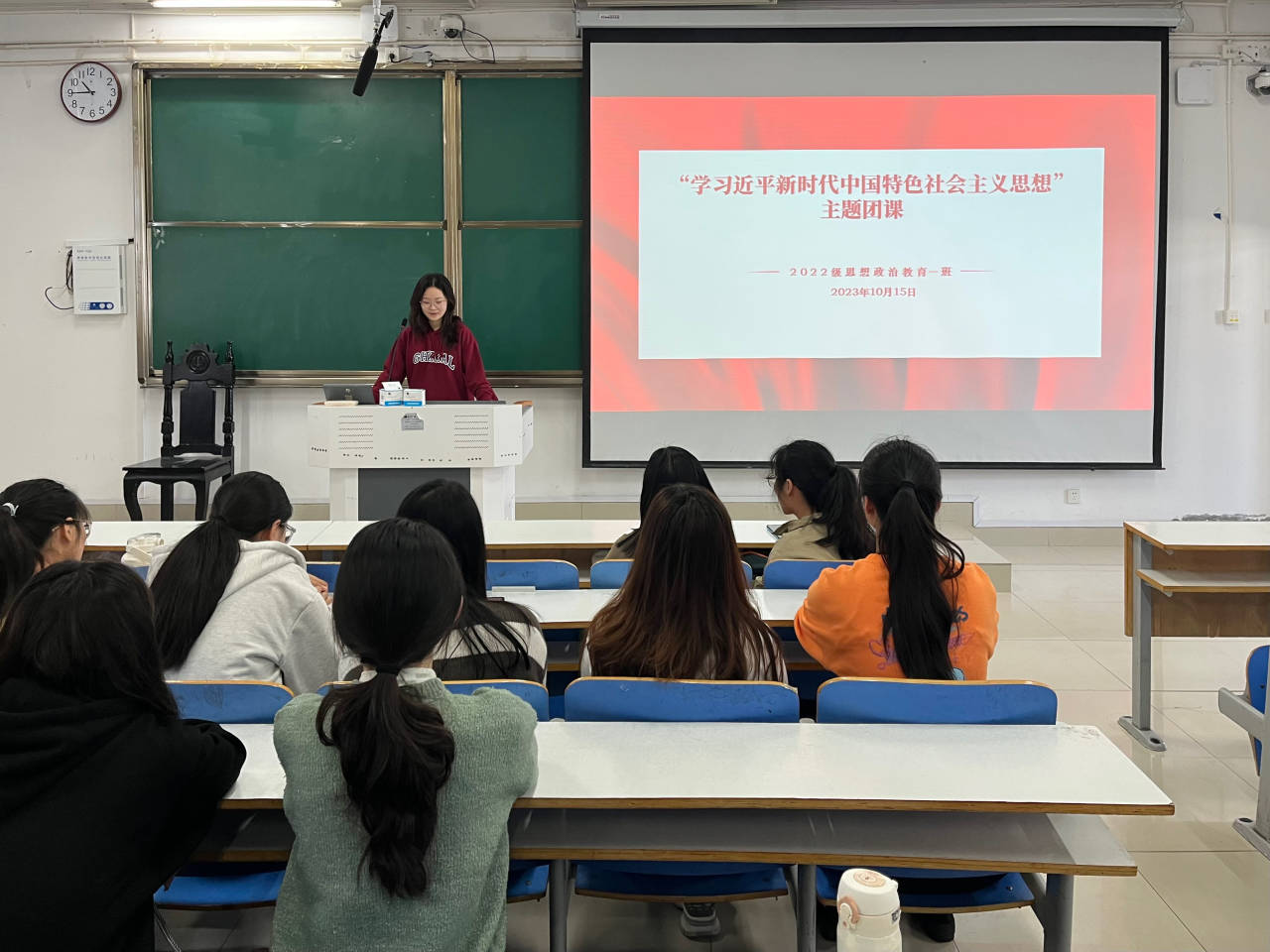 为进一步贯彻习近平新时代中国特色社会主义思想,10月15日上午,pp电子官方网站2022级思想政治教育一班在社科楼514教室召开“学习习近平新时代中国特色社会主义思想”主题团课。pp电子官网2022级思想政治教育一班全体同学共同参与本次团课,团课由团支书李佳茹主持。