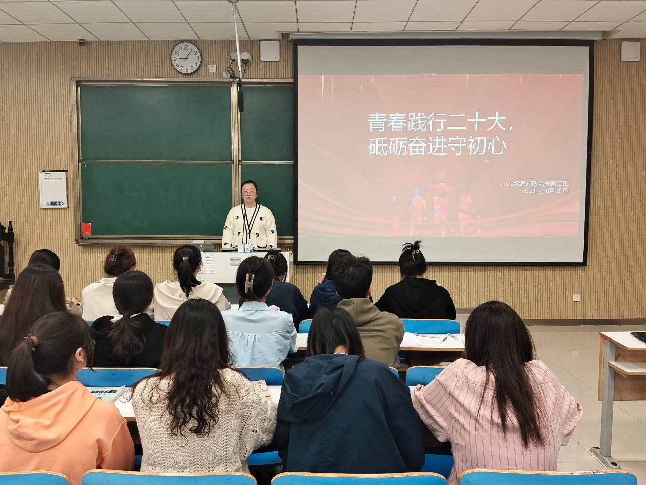 为深入学习贯彻党的二十大精神,加强班级同学思想建设,10月15日上午,pp电子官方网站2022级思想政治教育二班在社科楼515教室召开“青春践行二十大,砥砺奋进守初心”主题团课。pp电子官网2022级思想政治教育二班全体团员共同参加此次团日活动。活动由团支书李佳音主持。