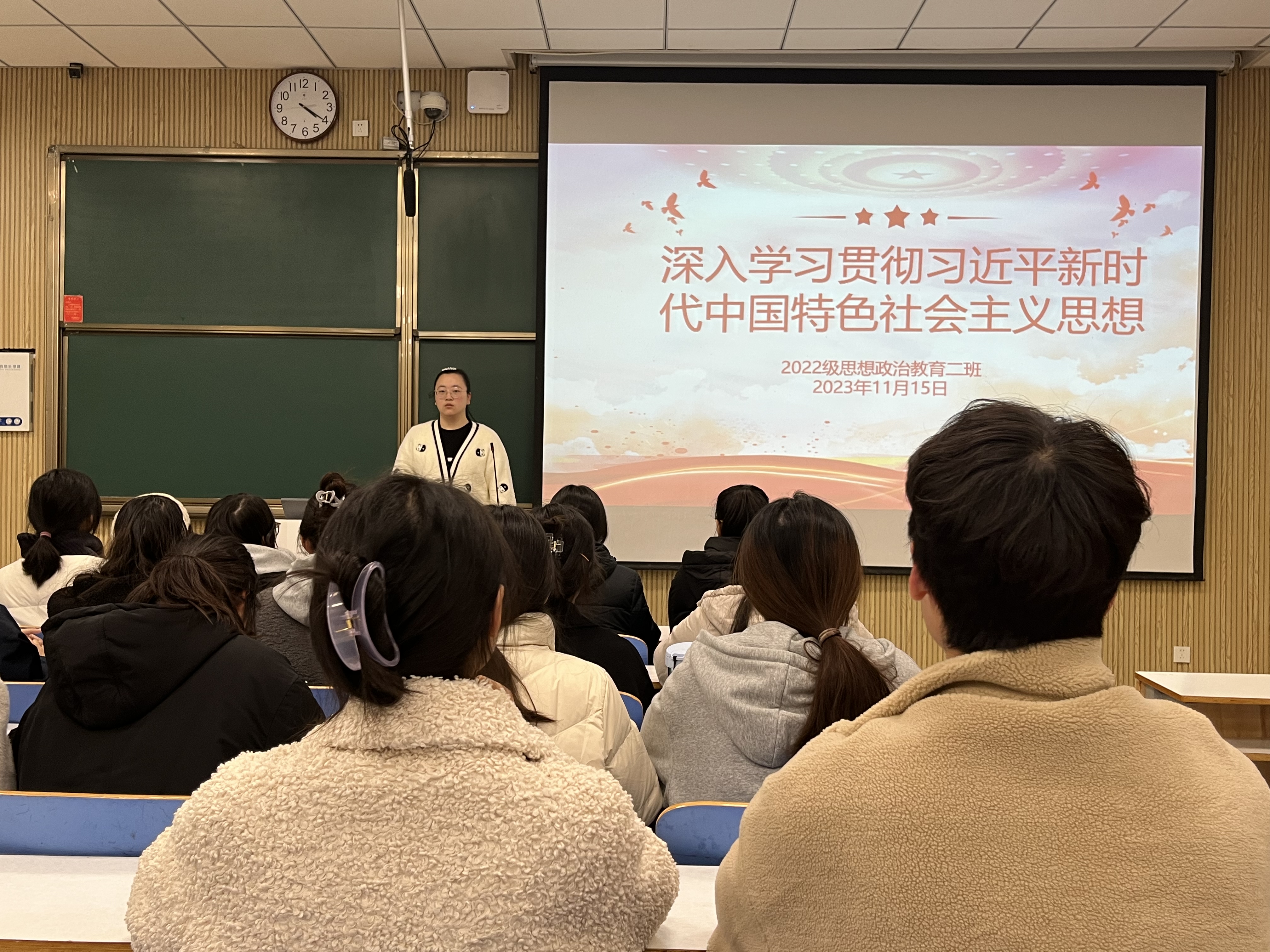 为深入学习习近平新时代中国特色社会主义思想,落实立德树人的根本任务,11月15日下午,pp电子官方网站2022级思想政治教育二班在社科楼515教室召开“深入学习贯彻习近平新时代中国特色社会主义思想”主题团课。pp电子官网2022级思想政治教育二班全体成员共同参与此次团课。团课由团支书李佳音主持。