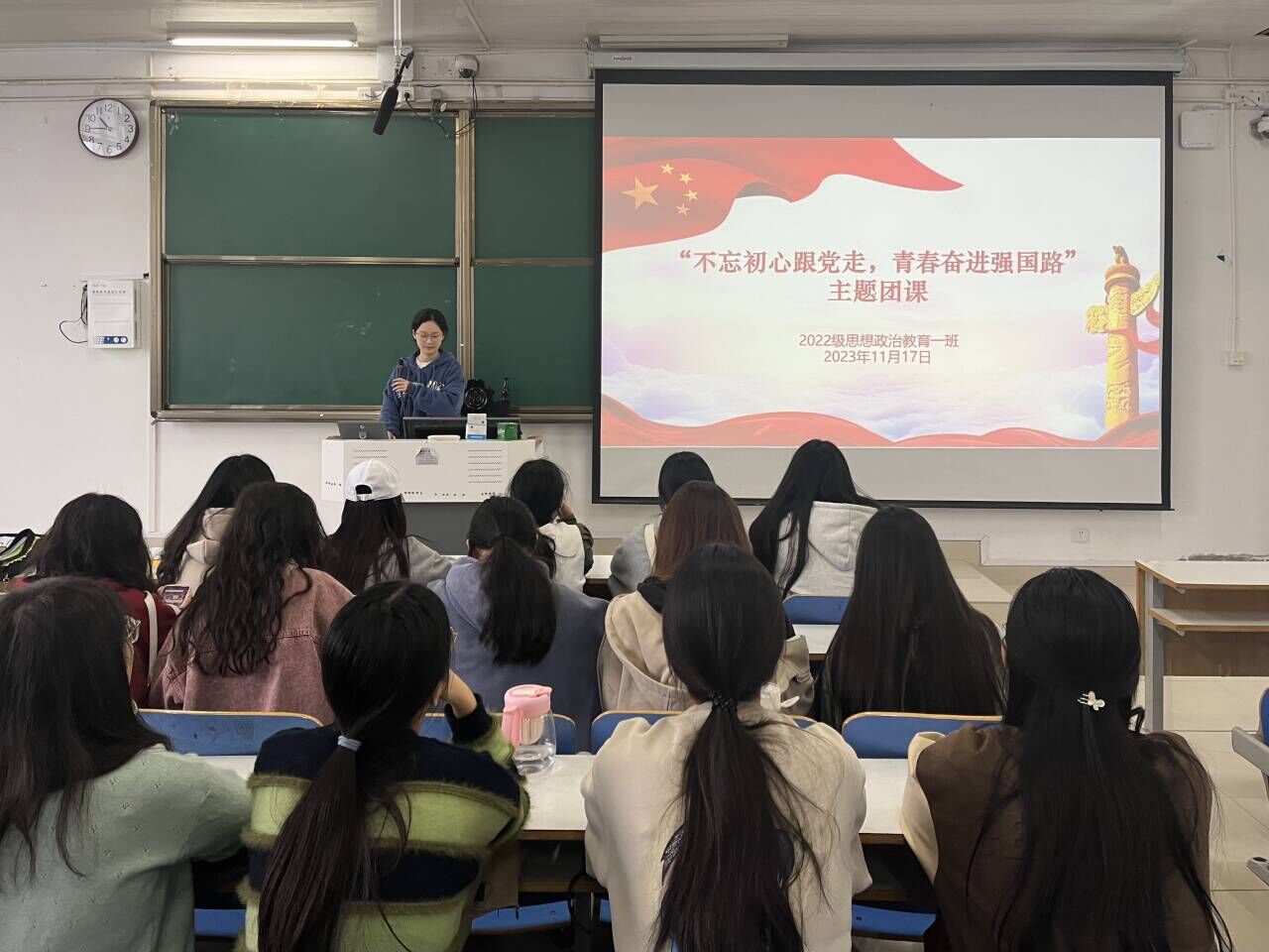 为激励广大青年的奋进力量,11月17日上午,pp电子官方网站2022级思想政治教育一班在社科楼514教室召开“不忘初心跟党走,青春奋进强国路”主题团课。pp电子官网2022级思想政治教育一班全体同学共同参与本次团课,团课由团支书李佳茹主持