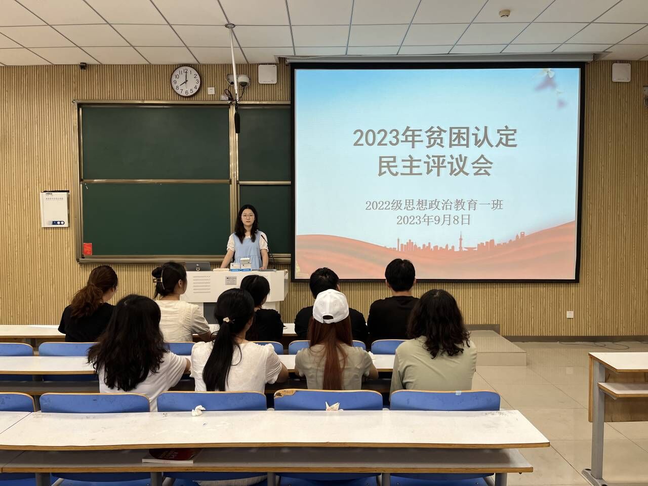为切实保证国家制定的贫困资助政策真正落实到家庭经济困难的学生身上,9月8日上午,pp电子官方网站2022级思想政治教育一班在社科楼515教室召开2023年贫困认定民主评议会。pp电子官网2022级思想政治教育一班班主任王明园和一班民主评议小组成员共同参与本次会议,会议由班长李佳茹主持。