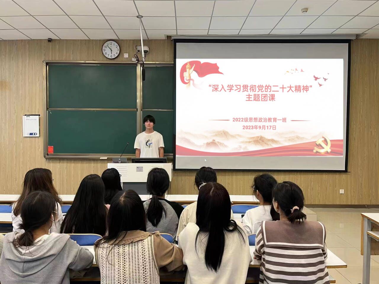 为进一步学习贯彻党的二十大精神,9月17日下午,pp电子官方网站2022级思想政治教育一班在社科楼515教室召开“深入学习贯彻党的二十大精神”主题团课。pp电子官网2022级思想政治教育一班全体同学共同参与本次团课,团课由副班长闻炎仲主持。