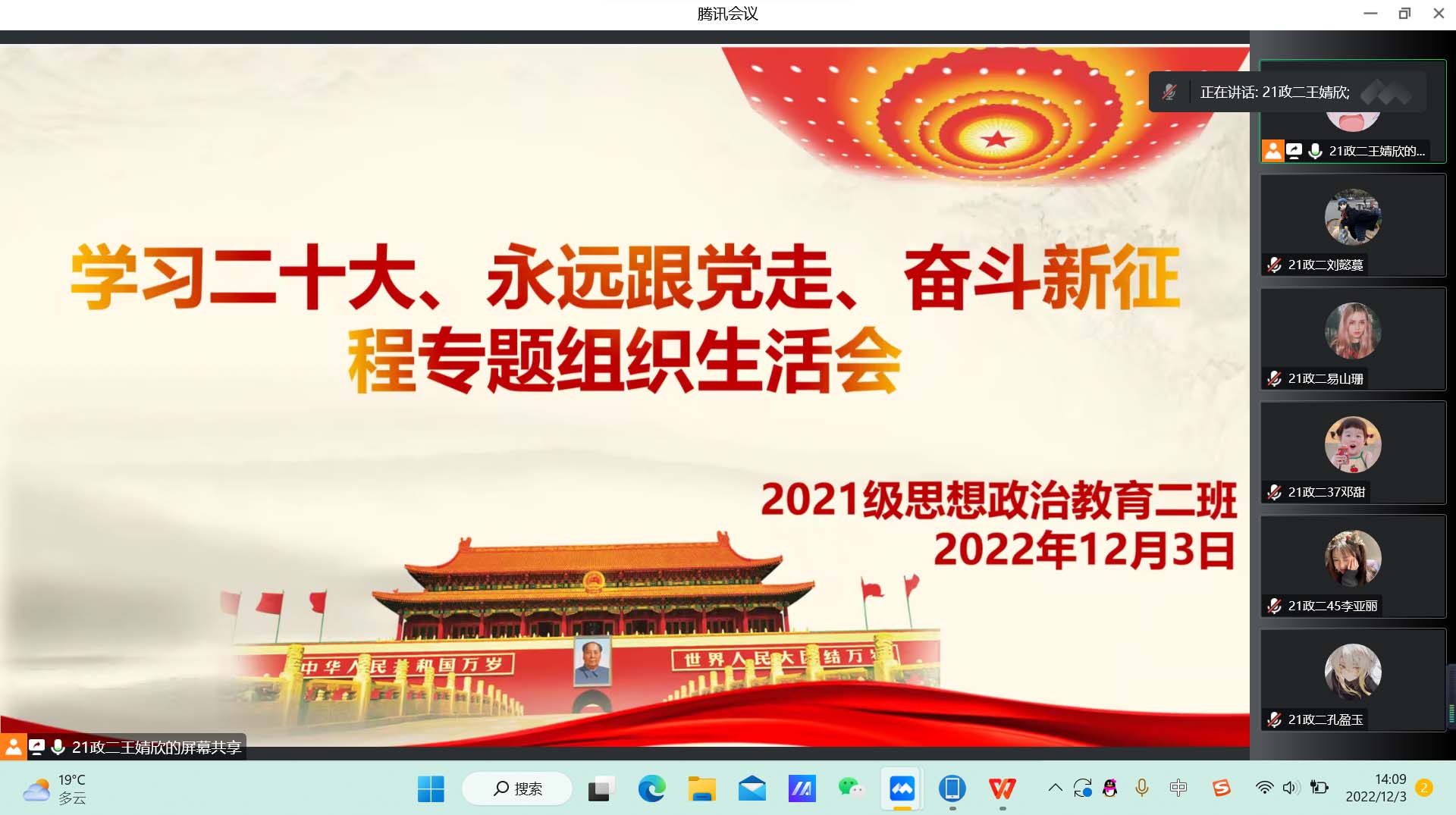 12月3日下午,pp电子官方网站2021级思想政治教育二班团支部在腾讯会议召开学习二十大、永远跟党走、奋进新征程专题组织生活会。2021级思想政治教育二班全体团员参加此次组织生活会。组织生活会由团支书王婧欣主持。