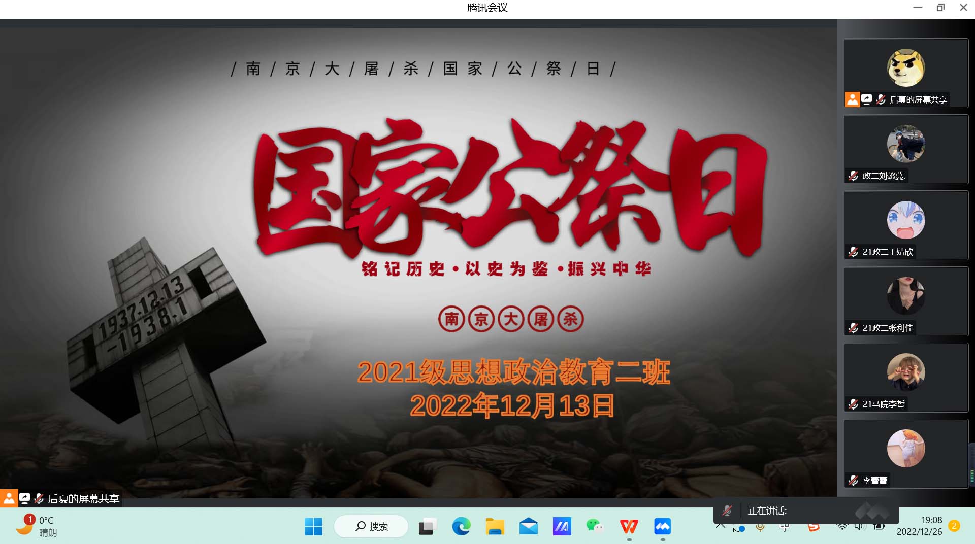 12月13日下午,pp电子官方网站2021级思想政治教育二班在腾讯会议召开“铭记历史·以史为鉴·振兴中华”国家公祭日主题班会。2021级思想政治教育二班全体成员共同参加此次班会。班会由团支书王婧欣主持。