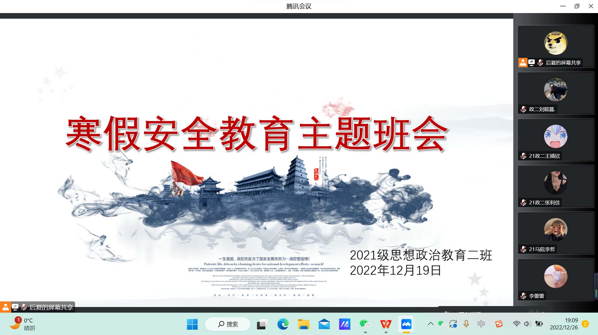 12月19日下午,pp电子官方网站2021级思想政治教育二班在腾讯会议召开寒假安全教育主题班会。2021级思想政治教育二班全体成员共同参加此次主题班会。班会由副班长任振豪主持。