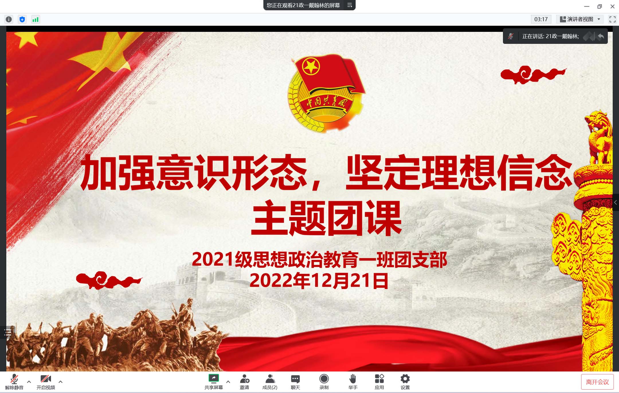 12月21日下午,pp电子官方网站2021级思想政治教育一班在腾讯会议召开线上“加强意识形态,坚定理想信念”主题团课。2021级思想政治教育一班全体团员参加了本次团课。团课由团支书戴翰林主持。