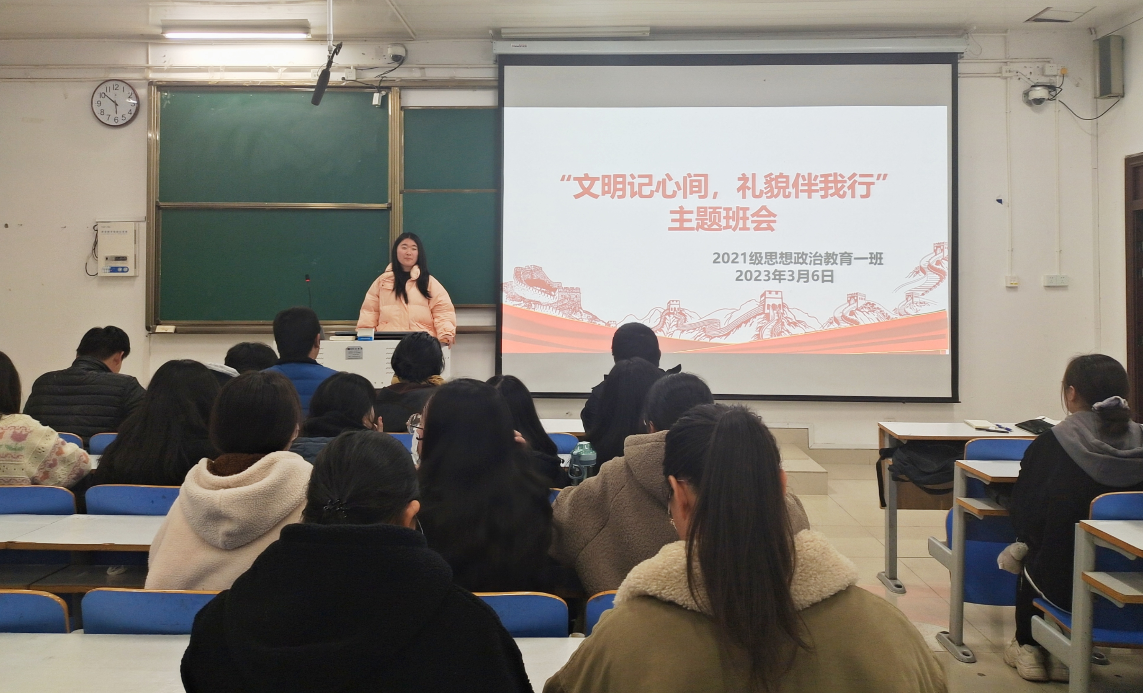 为加强校园文明建设,增强学生文明意识,营造文明、和谐的育人环境。3月6日下午,pp电子官方网站2021级思想政治教育一班在社科楼514教室召开“文明记心间,礼貌伴我行”主题班会。2021级思想政治教育一班全体成员共同参与本次班会。班会由副班长雷敏主持。