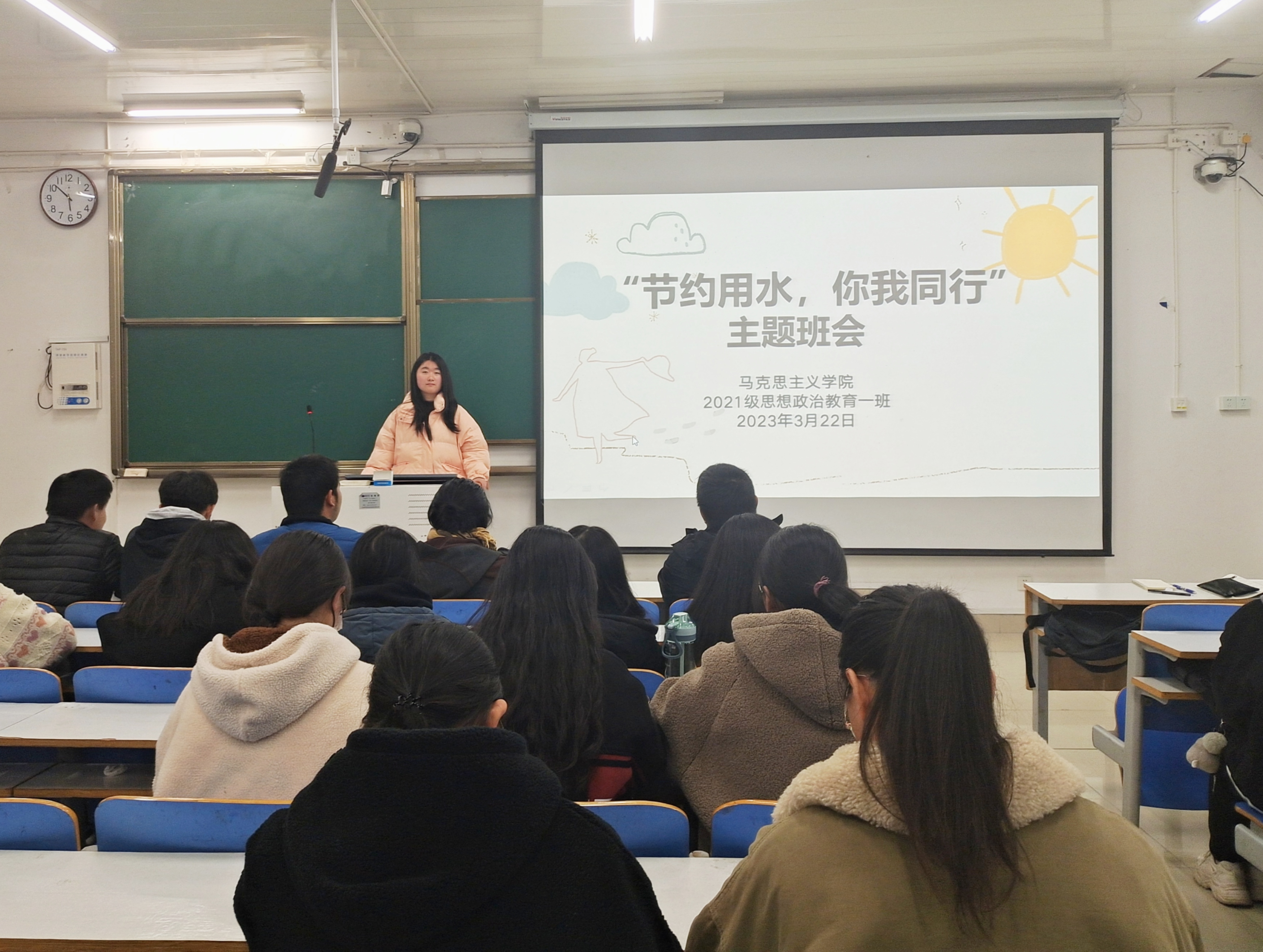 为培育学生养成节约用水的良好习惯,树立生态环境保护意识。3月22日下午,pp电子官方网站2021级思想政治教育一班在社科楼514教室召开“节约用水,你我同行”主题班会。2021级思想政治教育一班全体成员共同参与本次班会。班会由副班长雷敏主持。