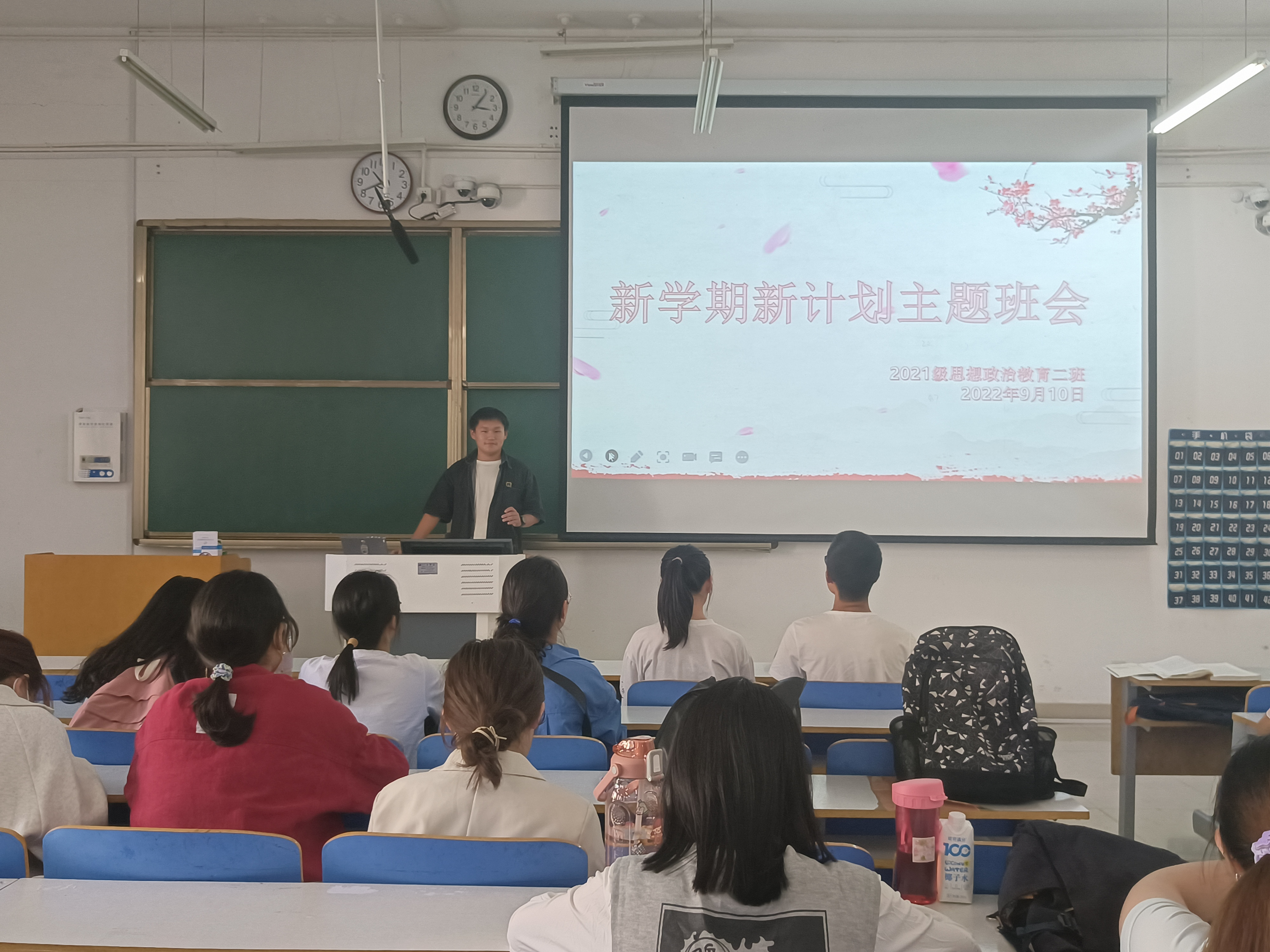 首先,任振豪指出,计划可以指引我们前进的方向,是我们自我激励的动力来源,所以新学期要制定新的计划。接着,他表示,学习计划要在身体、心理和学习上统筹兼顾,并且要根据各学科的特点、规律和自身的基础,“因科制宜”来制定不同学科的学习计划。随后,他强调,班级共同计划也很重要,2021级思想政治教育二班是一个积极向上的班集体,在新学期应该向着建成优秀班集体而努力,理应建立体系完备的班级管理制度。他着重从礼貌问好、考勤纪律、上课纪律等方面对同学们提出了要求。最后,王婧欣对班会做出总结,她表示,不论是制定班级共同计划还是个人学习计划都应该努力的去完成计划,不要让计划只是计划。