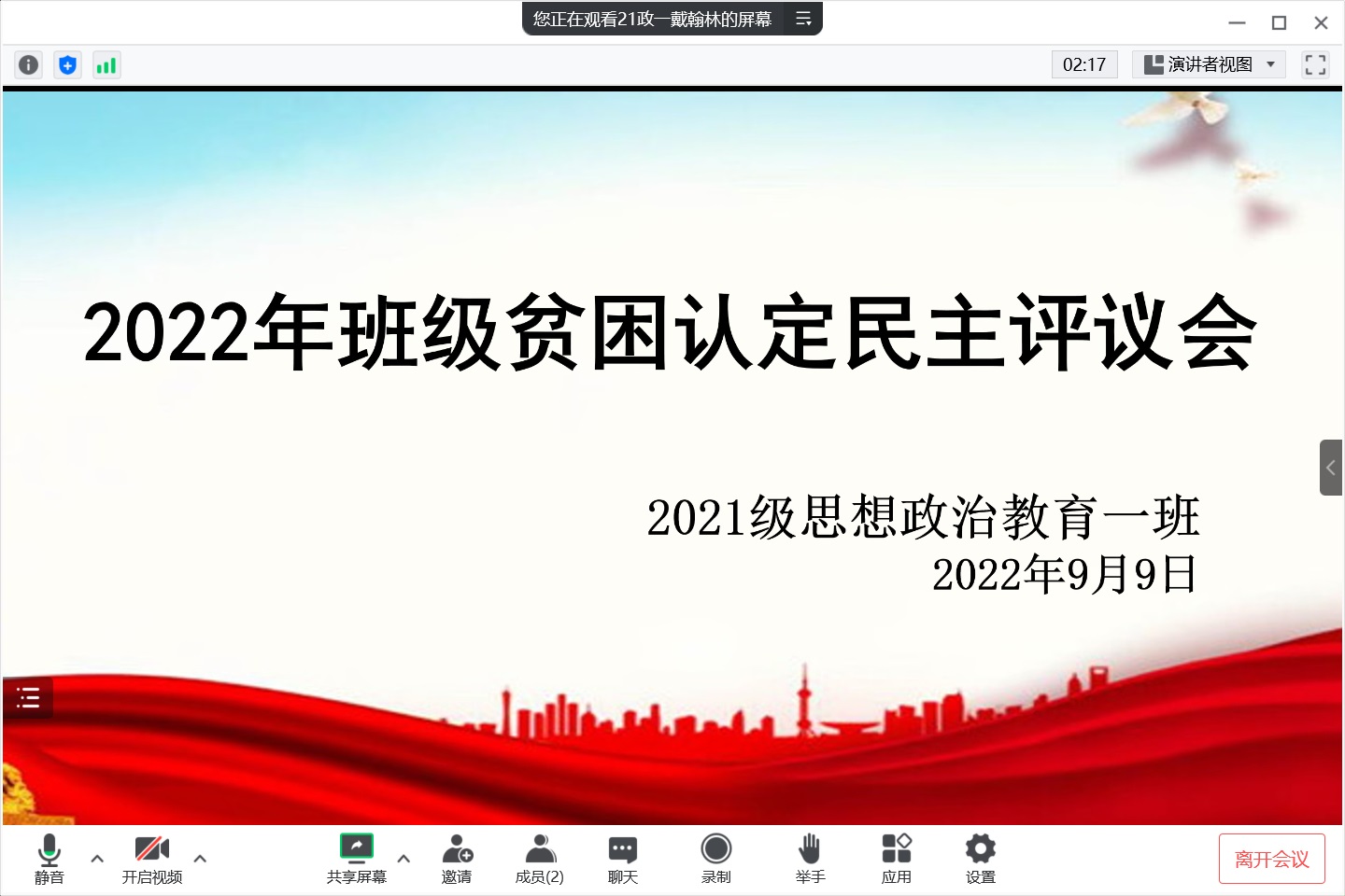 9月9晚上,pp电子官方网站2021级思想政治教育一班在腾讯会议召开线上2022年班级贫困认定民主评议会。评议会由辅导员曹菁菁、学生会权益保障部成员及2021级思想政治教育二班评议小组成员参加。评议会由班长戴翰林主持。