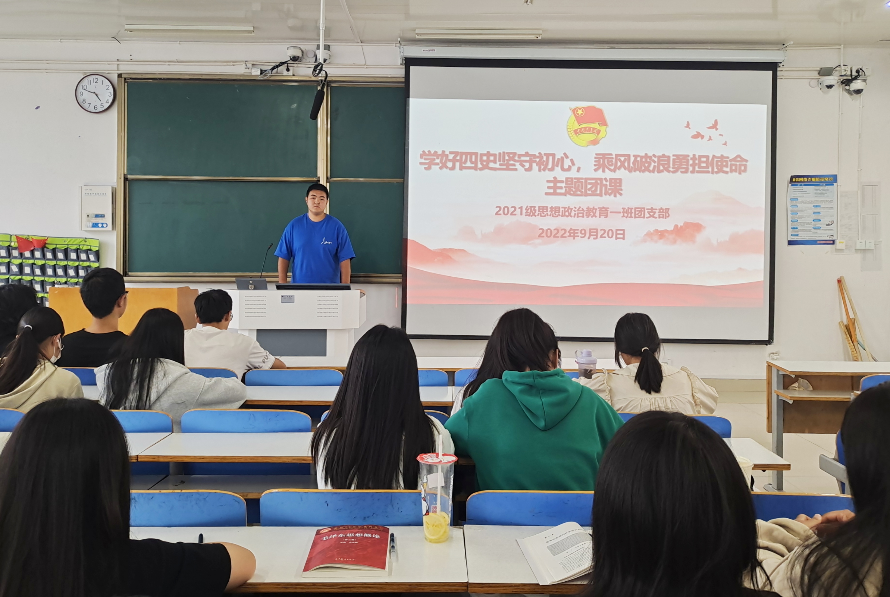9月20日下午,pp电子官方网站2021级思想政治教育一班在社科楼514教室召开“学好四史坚守初心,乘风破浪勇担使命”主题团课。2021级思想政治教育一班全体团员共同参加了本次团课,团课由团支书戴翰林主持。