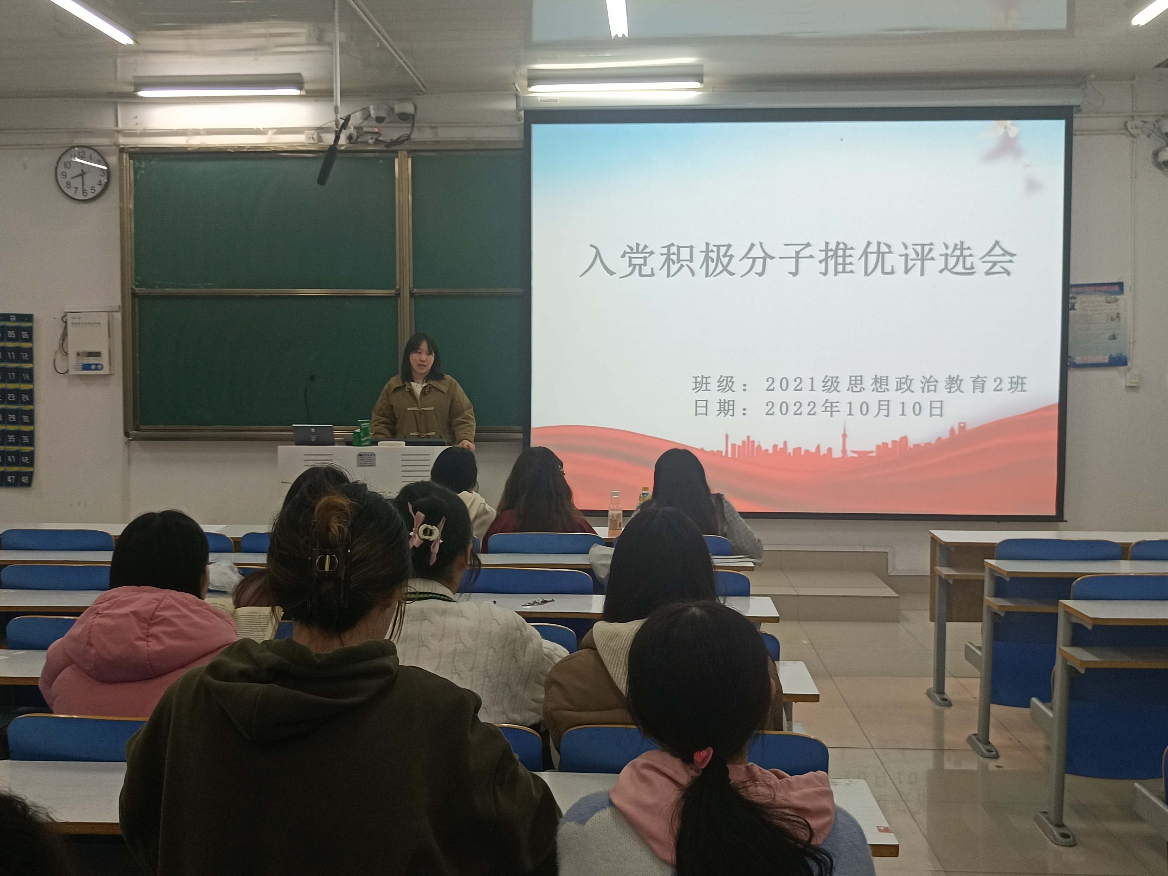 10月10日上午,pp电子官方网站2021级思想政治教育二班在社科楼514教室召开入党积极分子推优评选会。2021级思想政治教育二班全体成员参加此次评选会。评选会由团支书王婧欣主持。